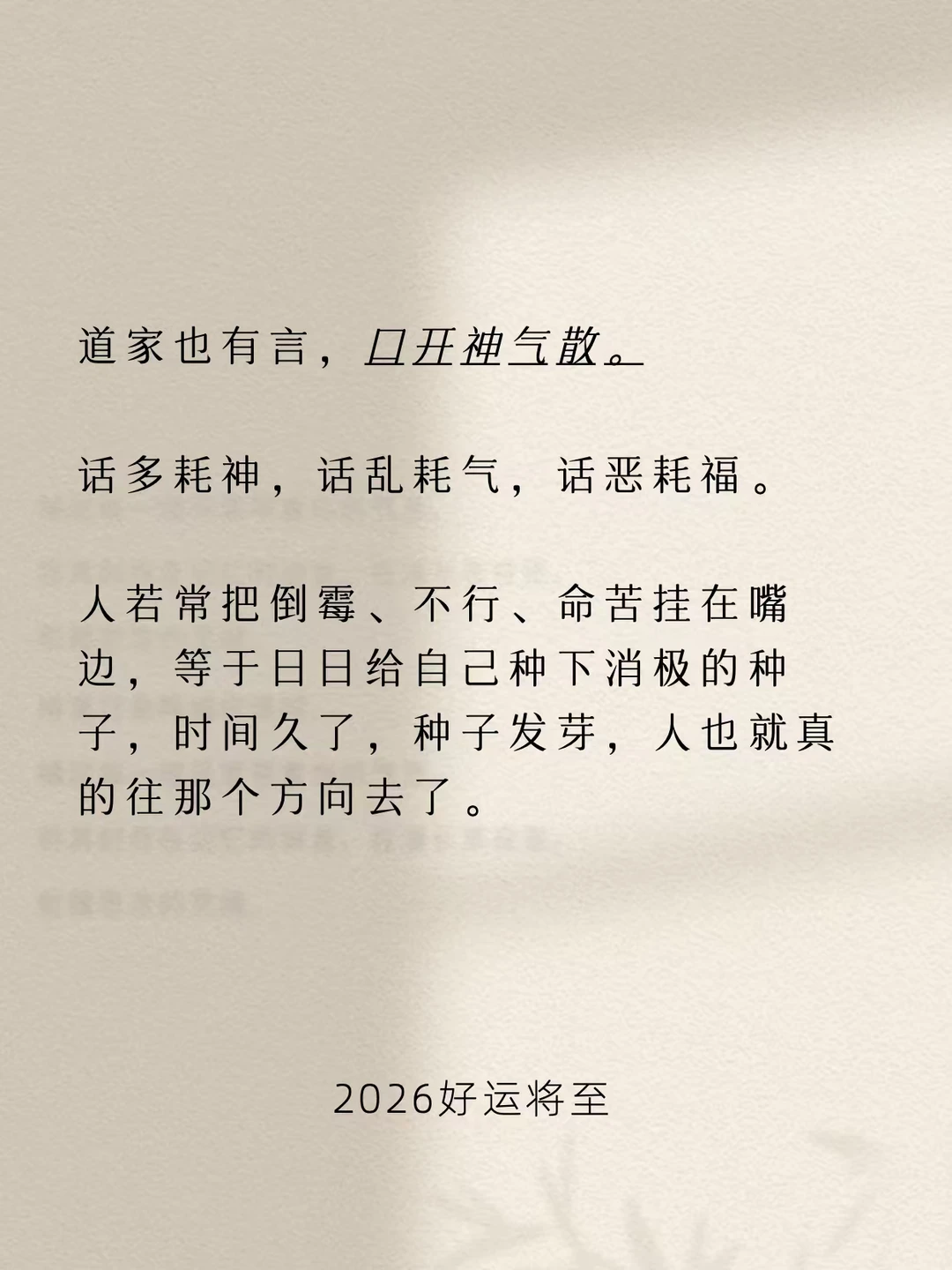 道家有言:“希言自然。”少说废话,不说伤人的话,不说丧气的话。安静一点,温和一点,福气反而更容易找上门。