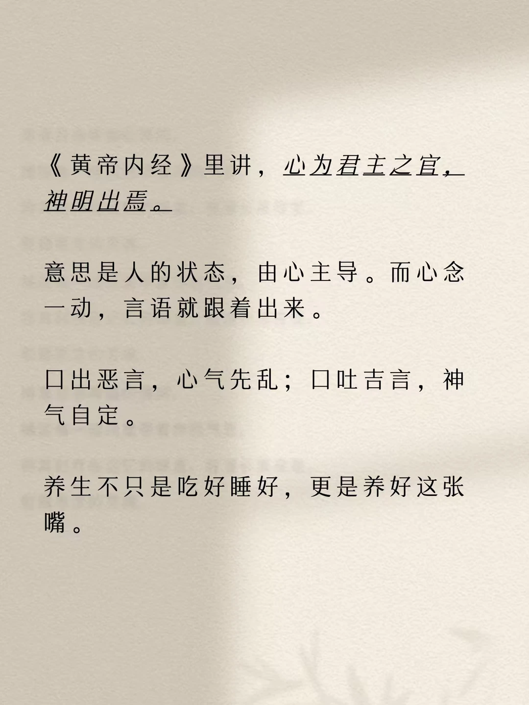 《黄帝内经》讲:“心者,君主之官也,神明出焉。”心念一动,言语就跟着出来。口出善言,神清气定;口出恶语,心气先乱。养生先养心,养心先养口。