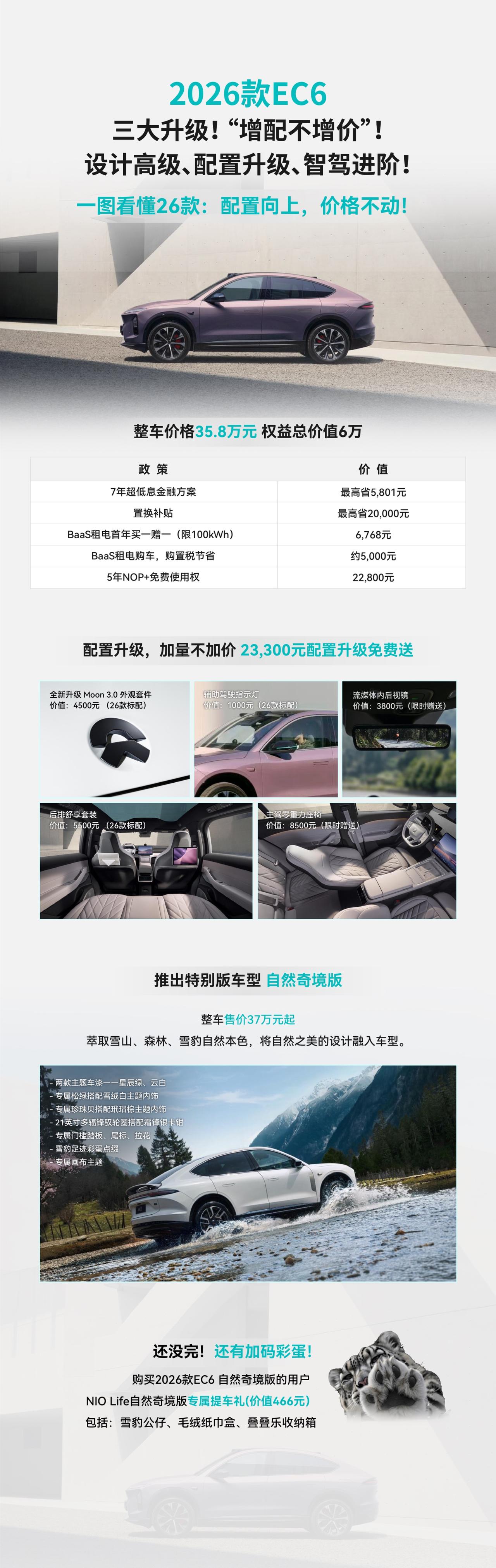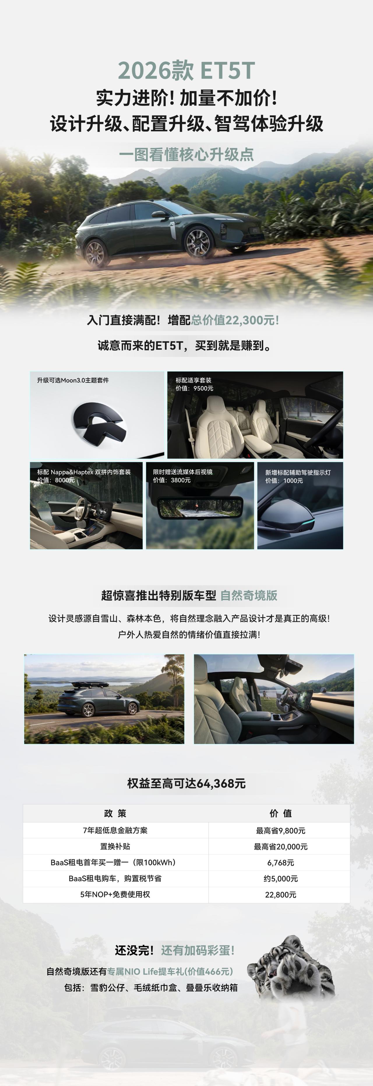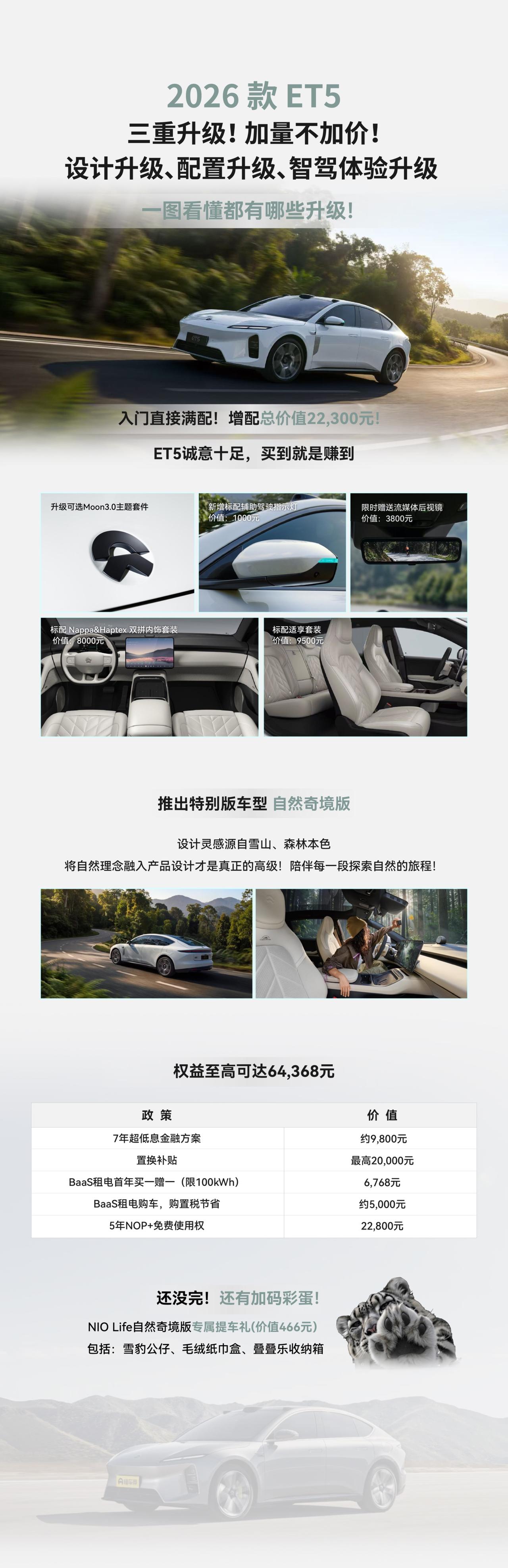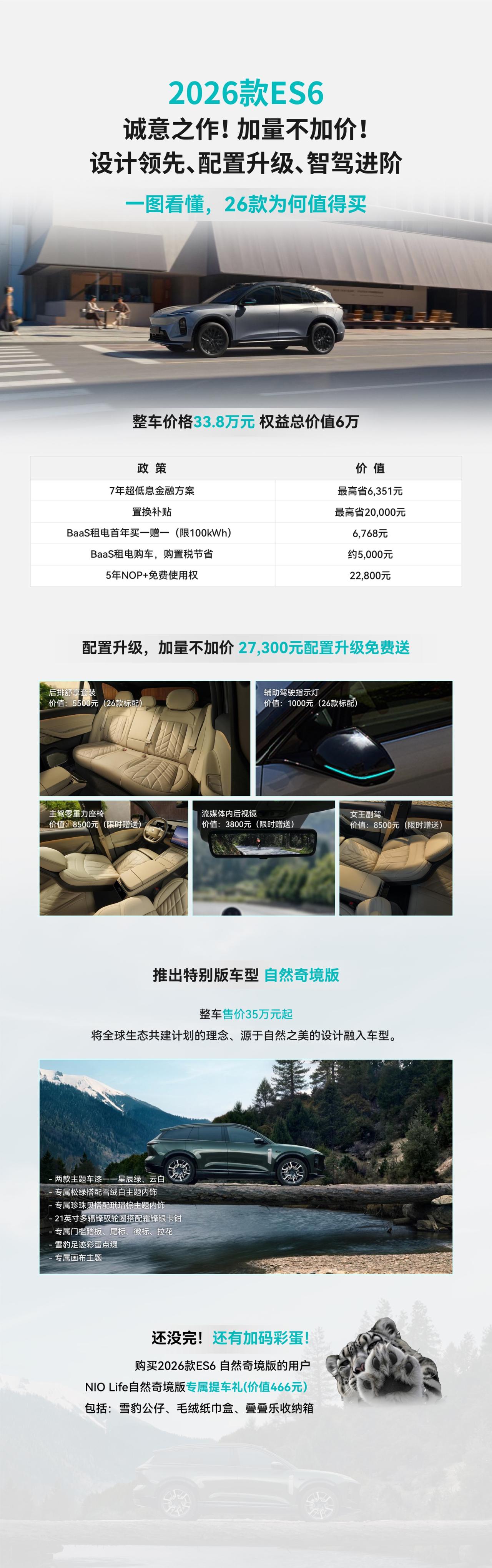 进入4月之后,蔚来开始频繁上新。他们在「5566」布局有四款车。中端车型其实是各个品牌的销量支柱,对于蔚来品牌本来也是一样的道理,但是ES8强大产品力和NT3.0平台的优势,让蔚来品牌反而呈现了高端市场销量更高的情况。 其实这几台5566,结合蔚来的补能领域生态优势,在细分市场还是有很强的竞争力。ES6是累计交付量稳居同级前列,凭借均衡的体验与百万公里验证的可靠品质,ET5T 则是纯电旅行车品类的绝对领导者,激活并做大了国内纯电旅行车的市场盘子。 2026 款车型在原有体系之上,大框架不改的情况下做了细节的升级。持续强化用户强感知的价值点,将豪华真皮、全车舒享配置直接纳入全系标配,加量不加价的逻辑,进一步强化产品的高价值标签。同步配套的限时权益,包含免费 5 年 NOP + 使用权、BaaS 租金优惠、0.49% 超低息金融政策,大幅降低消费者的决策门槛。 持续的价值加码,不断夯实「5566」车系在各自细分市场的首选心智,筑起品牌与品类的护城河,也始终以自身的产品节奏,定义高端纯电市场的价值标准。 新能源汽车