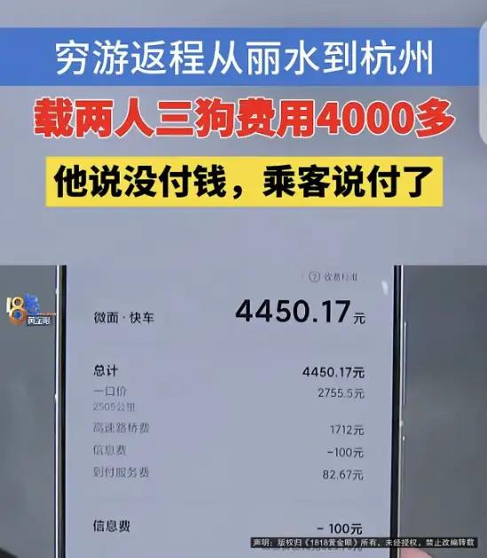 “玩不起!”浙江,一男子开面包车穷游西藏,为了省钱,在丽江拉上2个女子和她们的3条狗,全程2505公里,一共4450.17元车费。谁知,等到目的地后,2名女子却说车费已经在平台支付了,30分钟到账,然后拍屁股走人,男子打开平台一看,却发现一分钱都没收到。 浙江大哥薛先生,这趟穷游之旅,真是让人既心疼又解气。 这事还得从几年前说起。薛先生一直有个自驾西藏的梦想,奈何成家立业身不由己,前几年是没时间,后来是没钱。 直到前段时间,他翻出自己没休完的年假,咬咬牙,决定圆梦西藏。 出发前,他约了个朋友,俩人商量好开着他那辆面包车,轮流开车,朋友也不用出油钱。 可临到出发,朋友家里突发变故,去不了了。 薛先生骑虎难下,行程都准备妥当了,最终还是一个人上了路。 去程两千多公里,一个人开车累得够呛。虽然一路省吃俭用,但油费、饭钱也是笔不小的开支。 所以,返程时,薛先生就动了个心思。他想在顺风车平台接个单,拉个人分摊点油钱,总比空车跑回去强。 车子开到云南丽江,单子真来了。 两个年轻女子,带着三条宠物狗,要回杭州。目的地和薛先生返程刚好顺道,他二话不说就接了单。 一路上,薛先生心里挺乐呵。他算过,从丽江回杭州两千多公里,正常走高速,光油费过路费就得三四千。平台抽成后,自己还能落一笔,这趟旅行成本直接就降下来了。 他想着,这趟辛苦值了。 然而,两天两夜的长途跋涉,终于把人送到杭州目的地,戏剧性的一幕发生了。 两个女子下车后,薛先生提醒她们付款。 两人却一脸轻松地说:“放心吧,早就付好了,平台有延迟,三十分钟内肯定到账。” 说完,她们就带着狗头也不回地走了。 薛先生半信半疑,等了半小时,银行卡一分钱动静都没有。 他赶紧联系那两个女子,对方却一口咬定:“绝对付了,系统问题,再等等。” 薛先生越想越不对劲,直接拨通了平台客服电话。 客服的答复,让他心凉了半截:乘客根本没付款,订单状态是未支付。 薛先生立刻折返去找那两个女子,可对方态度极其蛮横,坚称自己付了,还拿出一张“付款截图”晃悠。 薛先生一眼就看穿了那是伪造的,日期都对不上! 双方争执不下,薛先生无奈之下只能报警。 可在警方面前,那两个女人依旧嘴硬,一口咬定付了,甚至还想倒打一耙说薛先生敲诈。 薛先生又请来了记者上门调解,结果人家直接闭门不见,还放狠话:再纠缠就报警抓你! 记者随后再次联系平台,得到的答复依然是:未支付。平台表示会全力追讨这笔款项,并对涉事账号进行封禁处理。 现在的局面很尴尬:薛先生开了两天两夜,跑了2505公里,车费4450.17元,一分钱没拿到。 两个女人呢,咬死付了,拿不出实锤,还耍无赖。 平台呢,也在走流程,能不能把钱追回来,还是个未知数。 这件事真的太让人窝火了! 薛先生一路辛苦,好心带人分摊路费,结果却被当成了冤大头。 这两个女子,为了省四千多块钱,丢掉的是做人最基本的诚信和底线。 几千块钱,能看清两个人的人品,虽然薛先生损失了钱财,但也算是及时止损。 大家觉得,这钱还能追回来吗?这两个女人,就该这么轻飘飘地被放过吗?