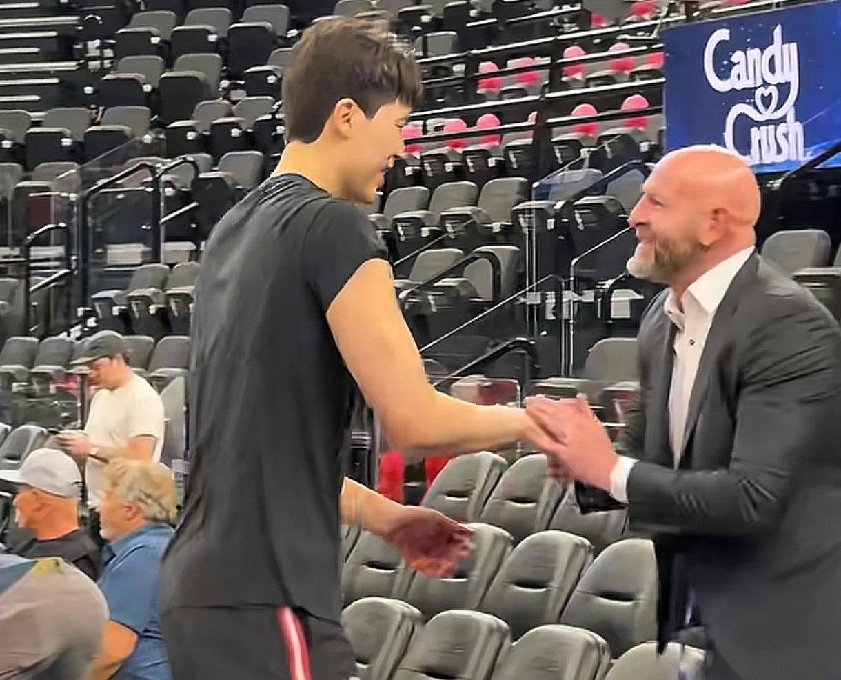 杨瀚森情商真高! 昨天,杨瀚森参加开拓者全队合练,训练过程中,球队总经理一旁观看,杨瀚森发现后,第一时间主动向其握手问好! 看得出,总经理对杨瀚森十分欣赏,眼神里透露出满满的宠幸,毕竟他背后是14亿人巨大的商业市场