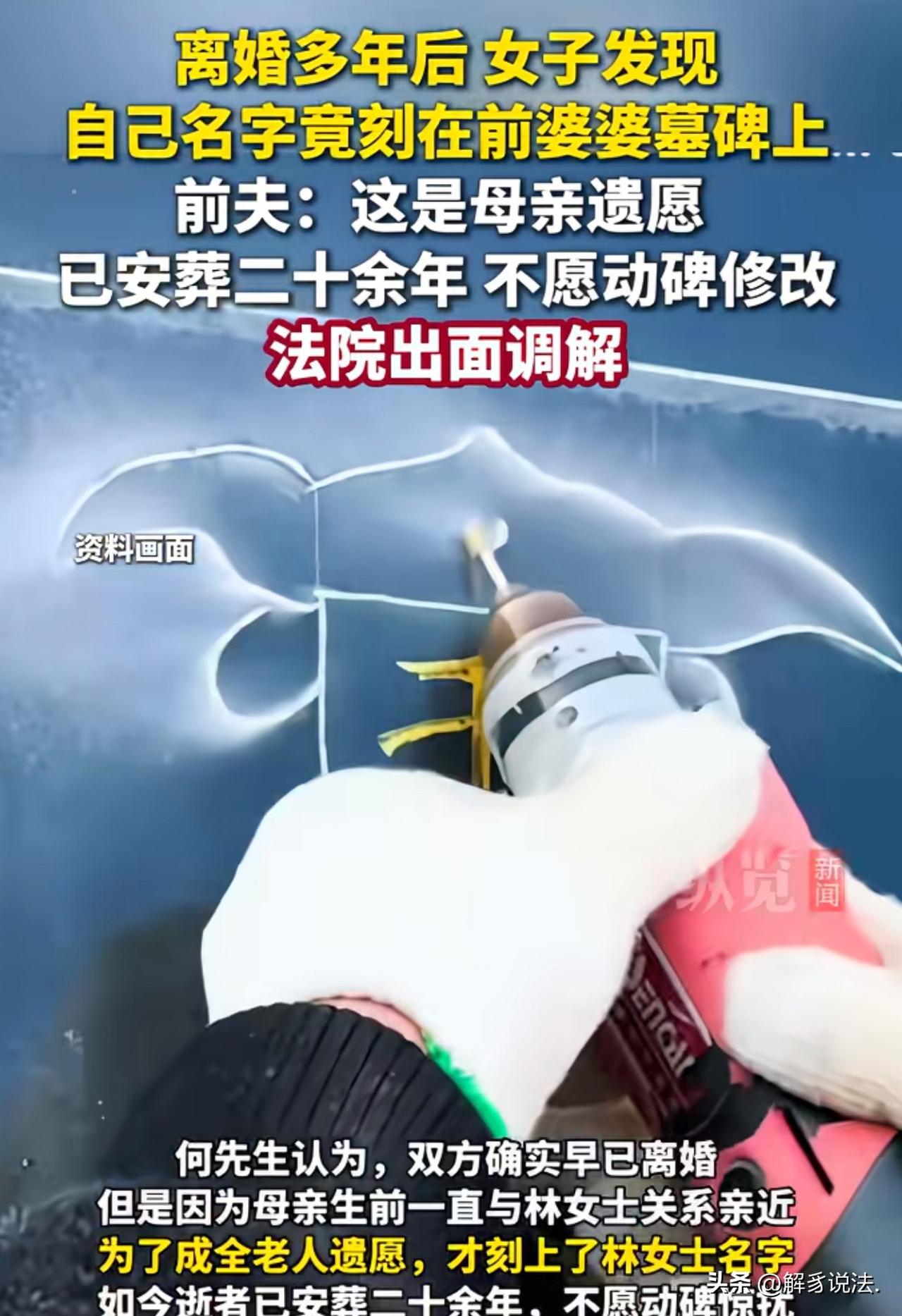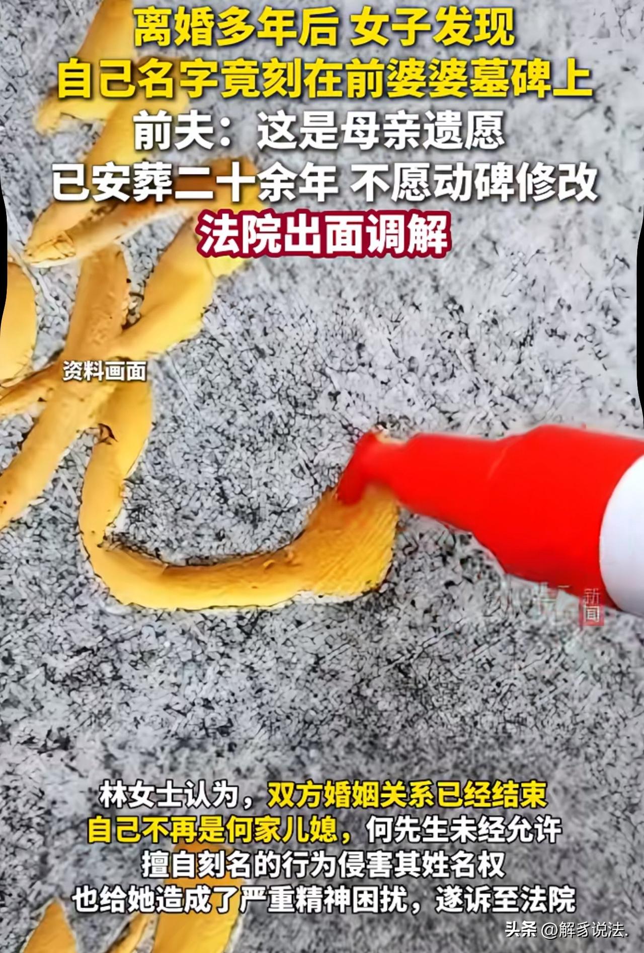 上海,女子与前夫离婚30多年,意外在女儿口中得知,她的名字竟刻在了前婆婆的的墓碑上,女子火冒三丈,找到前夫要求去除名字。前夫说:这是母亲的遗愿,拒绝去除名字。女子一气之下将前夫告到法院,法院这样调解了。网友:这不是个问题吧,曾经的儿媳呀,刻上说明人家认可你呀! 阿姨姓林,今年快七十岁了,三十多年前,她和前夫老何因为过不到一起去,和平办理了离婚手续,当时女儿还小,俩人约定好,好好抚养孩子,互不打扰彼此的生活。 这三十多年里,林阿姨重新组建了家庭,日子过得平淡又安稳,老何也有了自己的归宿,本来以为这辈子就这样相安无事,可女儿的一句话,彻底打破了这份平静。 前段时间清明前后,女儿想着去给爷爷奶奶上坟,毕竟是自己的亲祖辈,这么多年一直没断了祭拜。可等女儿祭拜完回来,跟林阿姨闲聊时,无意间提了一句,说奶奶的墓碑上,竟然刻着她的名字,还标注着“儿媳”的身份。 林阿姨一听,当时就火冒三丈,差点没控制住自己的脾气。她反复问女儿,是不是看错了,女儿肯定地说,绝对没看错,墓碑上的名字清清楚楚,就是她的名字,而且跟爷爷奶奶的名字刻在一起,位置还很显眼。 林阿姨越想越生气,她跟老何离婚三十多年,早就不是何家的人了,怎么能还以“儿媳”的身份,刻在前婆婆的墓碑上?更让她膈应的是,这件事她从头到尾都不知道,没有任何人跟她商量过,就连一句通知都没有,这不是明摆着不尊重她吗? 其实林阿姨心里也清楚,当年她和前婆婆的关系不算差,不像有些婆媳那样针锋相对,哪怕后来跟老何离婚,逢年过节她也会让女儿给前婆婆带点东西,偶尔碰到,也会客气地打个招呼,但这并不代表,她愿意以何家儿媳的身份,被刻在墓碑上,毕竟她已经有了自己的家庭,这样一来,不仅让她心里不舒服,也可能让现在的家人产生误会。 平复了一下情绪,林阿姨当即就给老何打了电话,开门见山地要求他尽快把自己的名字从前婆婆的墓碑上去掉。电话那头的老何,听到林阿姨的要求,语气瞬间沉了下来,直接拒绝了她。 老何说,刻她的名字,不是他自己的主意,是他母亲生前的遗愿,老太太活着的时候,一直很认可林阿姨这个儿媳,哪怕儿子和她离婚了,老太太也总念叨着她的好,临终前还特意嘱咐,一定要把林阿姨的名字刻在自己的墓碑上,算是了却自己的一个心愿。 老何还说,老太太已经去世二十多年了,墓碑一动,就是惊扰逝者,他不能违背母亲的遗愿,也不能做对逝者不敬的事。 俩人在电话里吵得不可开交,林阿姨觉得,老何就是在找借口,就算是前婆婆的遗愿,也得经过她的同意,毕竟这是她的名字,关乎她的姓名权和人格尊严;老何则觉得,林阿姨太不近人情,老太太一片好心,只是想留个念想,她却这么较真,一点情分都不讲。 吵到最后,俩人不欢而散,老何的态度依旧坚决,说什么都不肯动墓碑,林阿姨也是个急脾气,见老何不肯让步,一气之下,直接把老何告到了上海杨浦区人民法院,要求老何立即去除墓碑上她的名字,并赔偿她相应的精神损失。 法院受理此案后,并没有急于判决,法官也知道,这起纠纷不只是简单的法律问题,还牵扯着复杂的家庭情感,一边是林阿姨被侵犯姓名权的合理诉求,一边是老何想完成母亲遗愿、不愿惊扰逝者的孝心,要是强行判决,很可能会激化矛盾,让俩人彻底反目,就连女儿夹在中间也会为难。 其实法官在调解之前,也了解到一些过往,当年林阿姨和前婆婆相处和睦,哪怕离婚后,也没有断了联系,老太太对她的认可,周围的老邻居都看在眼里,老何坚持不肯动墓碑,也确实是出于对母亲的孝顺,并不是故意要为难林阿姨。 随后,法官依托街道综治中心,联合司法所的调解员,一起组织俩人进行调解,一边给老何讲法律知识,告诉她,根据民法典,姓名权受法律保护,未经本人同意,擅自将他人名字刻在墓碑上,属于侵犯他人姓名权,林阿姨有权要求去除名字;一边也劝林阿姨,理解老何的孝心,老何并不是故意要伤害她,只是一时没有考虑到她的感受。 经过多次调解,俩人的态度都缓和了不少,林阿姨表示,她并不是不讲情分,只要能把名字去掉,精神损失费可以让步,不再追究;老何也松了口,说可以体谅林阿姨的难处,会尽快做通家里其他亲属的工作,办理墓碑去名手续,同时自愿给林阿姨一笔经济补偿,算是表达歉意,也了结这段过往。 最终,双方达成了调解协议:老何在一个月内完成墓碑去名手续,自愿给予林阿姨经济补偿,双方确认,墓碑除名后,此事再无任何争议,从此互不纠缠。 这件事被传到网上后,瞬间引发了网友的热议,分歧特别大。有不少网友觉得,这根本不是什么大问题,林阿姨太较真了。 也有网友表示,支持林阿姨的做法,离婚三十多年,早就不是一家人了,姓名权是自己的,未经同意就刻在墓碑上,确实不尊重人,换成谁都会不舒服。 如果你是老何,你会优先完成母亲的遗愿,还是尊重前儿媳的意愿?