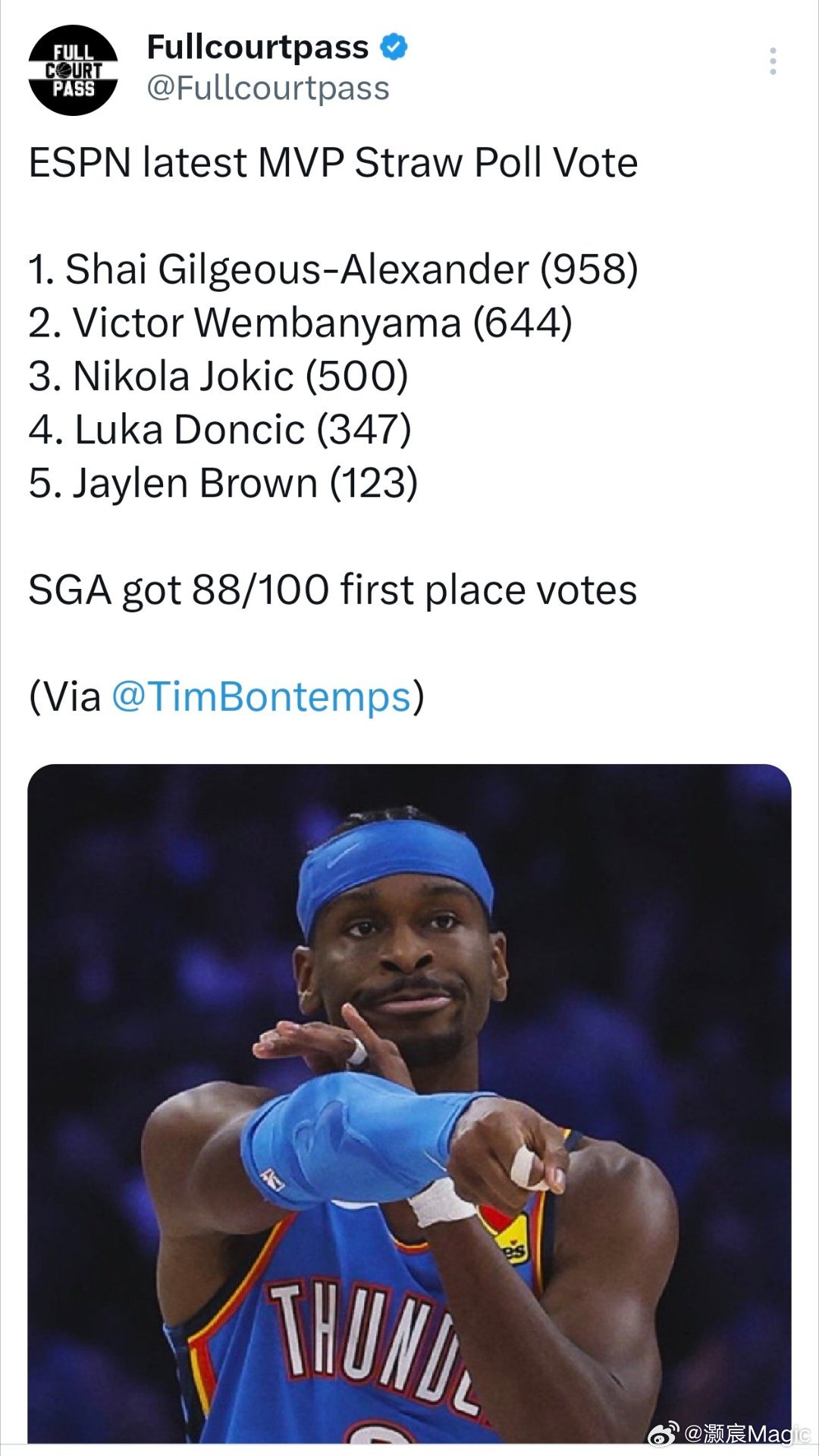 ESPN公布赛季第三次MVP模拟投票结果,亚历山大获得了88张第一选票、总得分9