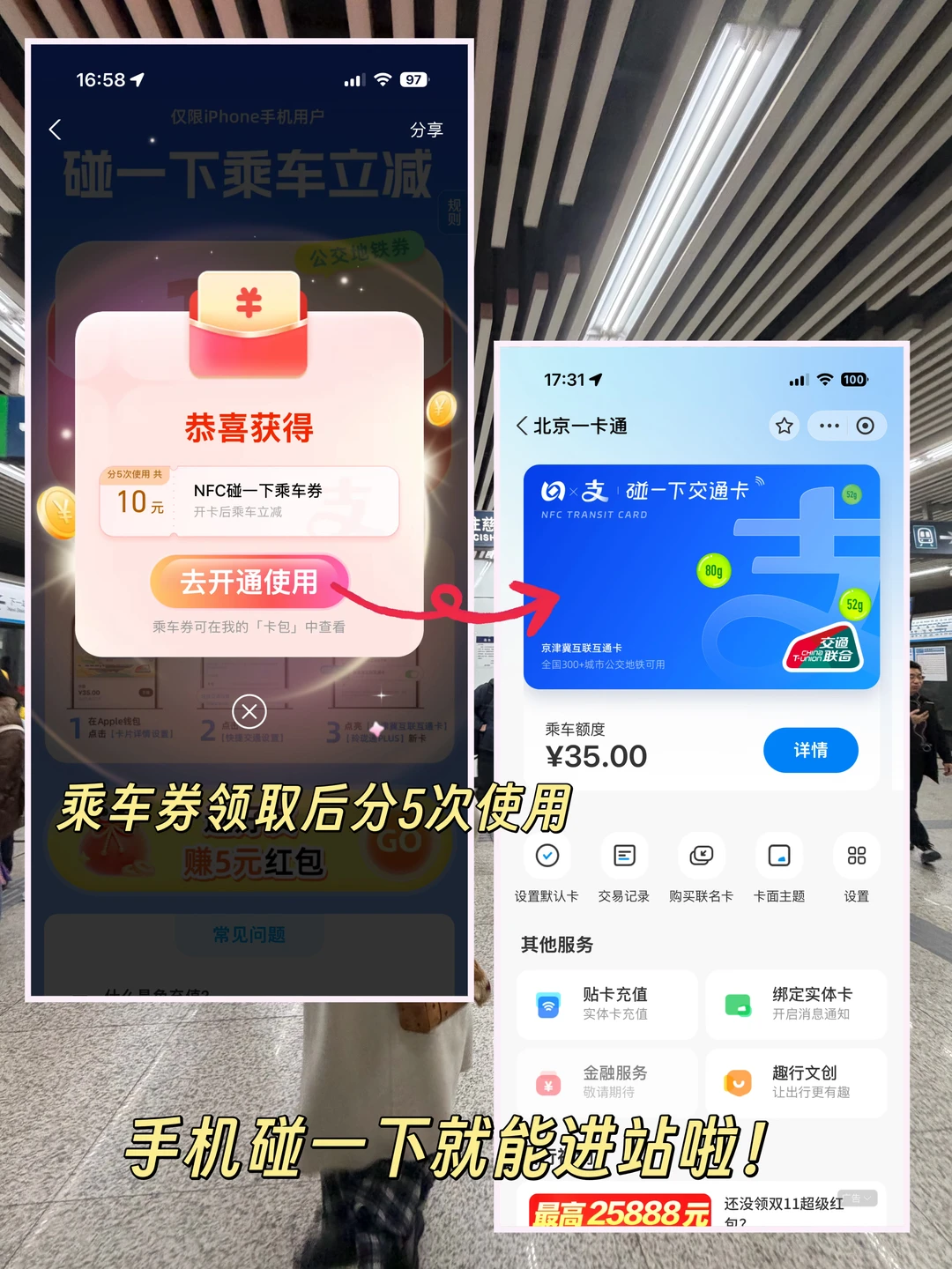 ✅碰一下秒通过:不用解锁手机,手机贴闸机就进站,早高峰省出打卡时间
