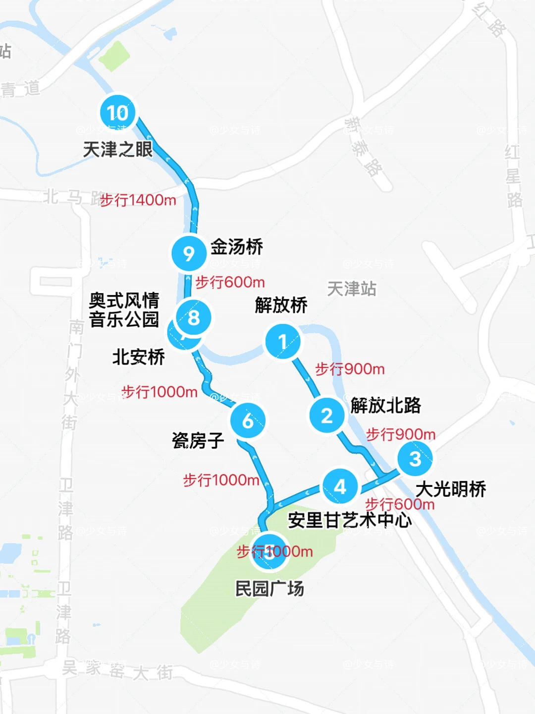🗺️路线:解放桥👉解放北路👉大光明桥👉安里甘艺术中心👉民园广场👉瓷房子 👉北安桥👉奥式风情音乐公园👉金汤桥👉天津之眼