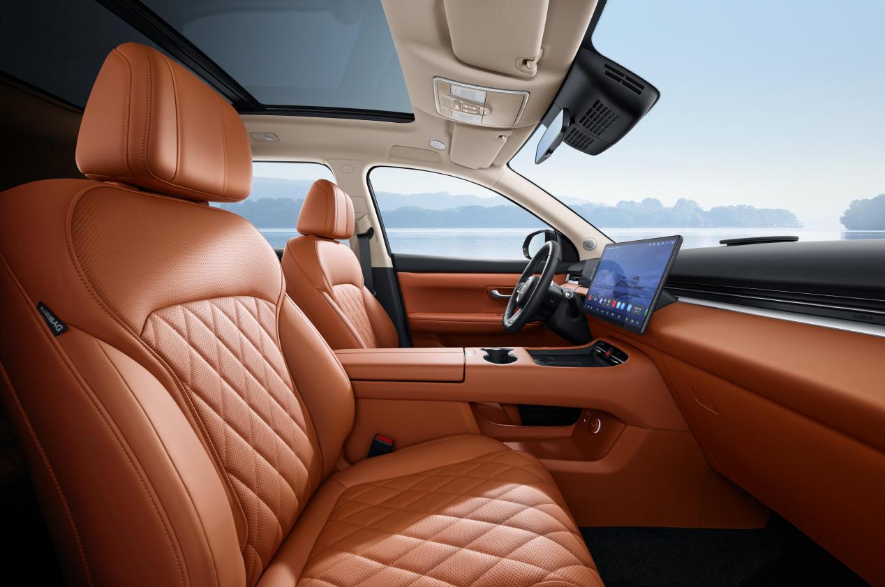 另外舒适配置越级,超过同价位品牌,全车绗缝工艺高级皮质座椅、一二排通风加热、方向盘加热、15.6英寸大屏、前排隔音玻璃,以及对外放电功能。
