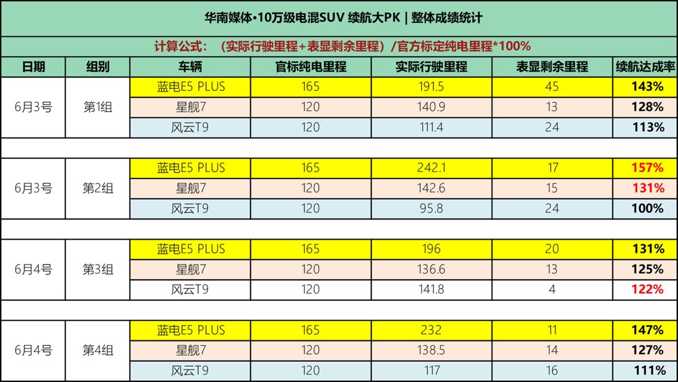 银河星舰7:标称120公里,实跑142.6公里(剩余15公里),达成率131%;