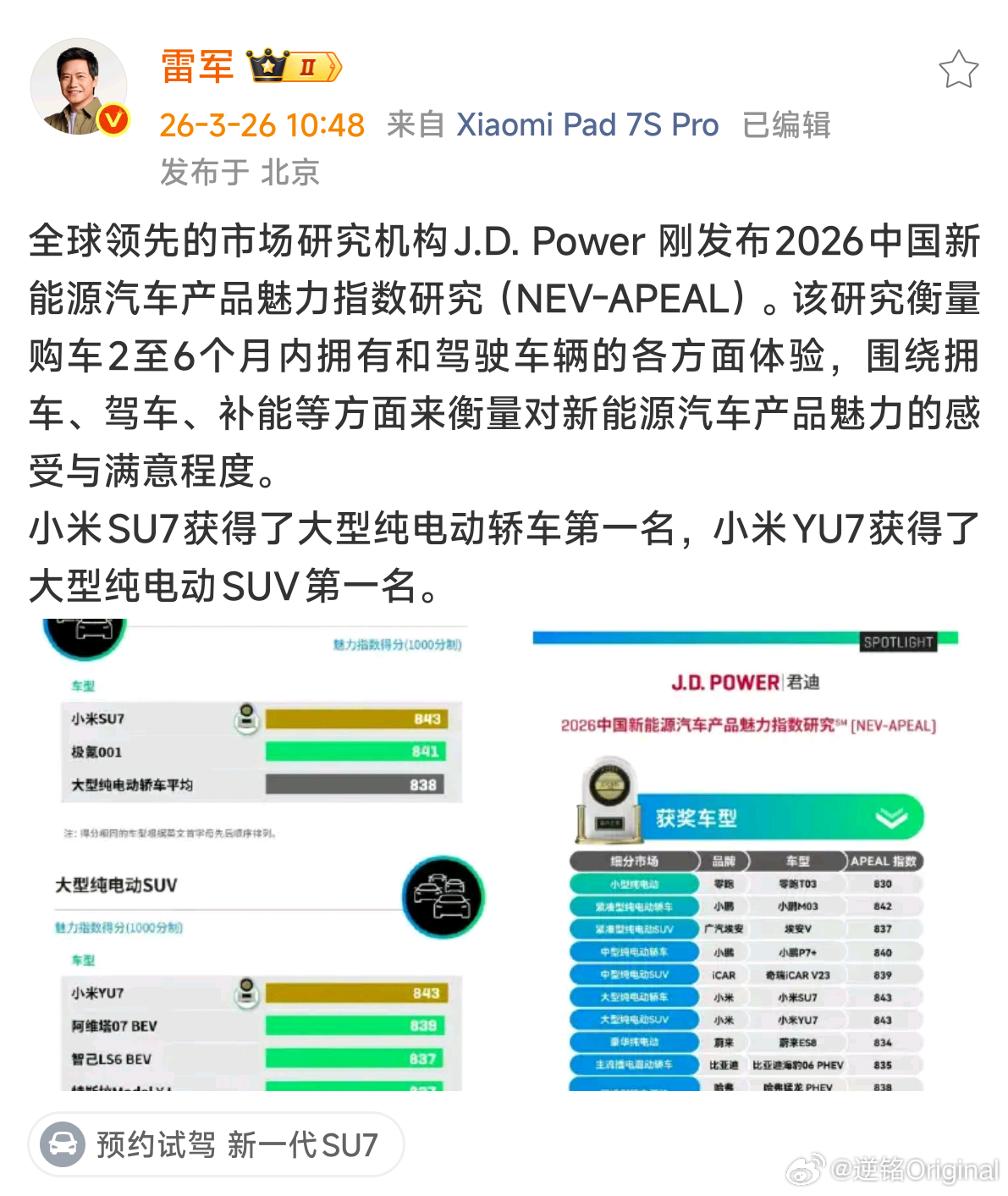 总之,在这一系列优势加持下,小米汽车在市场上乱杀是理所当然的事情,相信在多年以后,当大家回过头来盘点这几年中国新能源车最具代表性的产品,小米SU7和YU7都会是怎么都绕不过的双子星。雷军回应小米双车登顶JDPower魅力榜