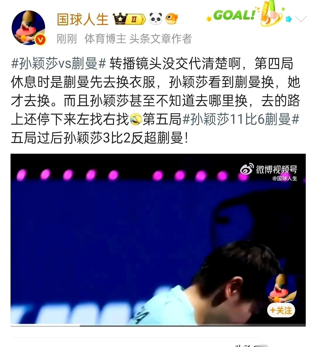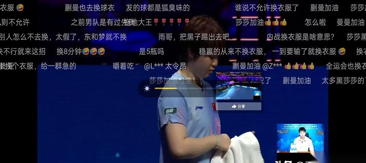 孙颖莎那场球,镜头明明白白地摆在那。 对手蒯曼先起身,走向场边,去换那件被汗浸透的衣服。 孙颖莎没动。 她坐在椅子上,把毛巾盖在头上,整个世界仿佛只剩下灯光和自己的呼吸声。 直到转播镜头里,对手的身影彻底消失在通道口,她才不紧不慢地拿起自己的球衣,准备更换。 就这么一个再正常不过的衔接动作。 可就这么几秒钟,各个直播间里,屏幕上的字已经叠成了一堵墙。 “输不起了?” “故意拖延时间,这手段真脏!” “看看,落后就开始耍心眼了。” 一条条冰冷的字,像针一样,从屏幕里扎出来。 没人去看回放,没人去注意那个时间差,铺天盖地的声讨,好像她是什么球场上的千古罪人。 很多年后,可能还是会有人记得那个瞬间,记得那些骂声。 但他们可能早就忘了,那个被骂的女孩,只是在对手离开后,才默默地拿起了自己的衣服。 说到底,有些人看的不是比赛,也不是真相,他们只是需要一个靶子。