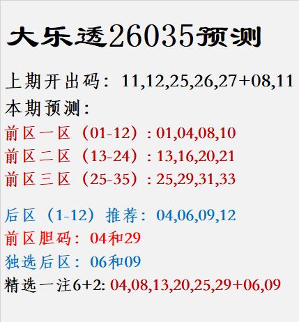 大乐透26035预测 上期开出码:11,12,25,26,27+08,11 本期预测: 前区一区(01-12): 01,04,08,10 前区二区(13-24): 13,16,20,21 前区三区(25-35): 25,29,31,33 后区(1-12)推荐:04,06,09,12 前区胆码:04和29 独选后区:06和09 精选一注6+2: 04,08,13,20,25,29+06,09