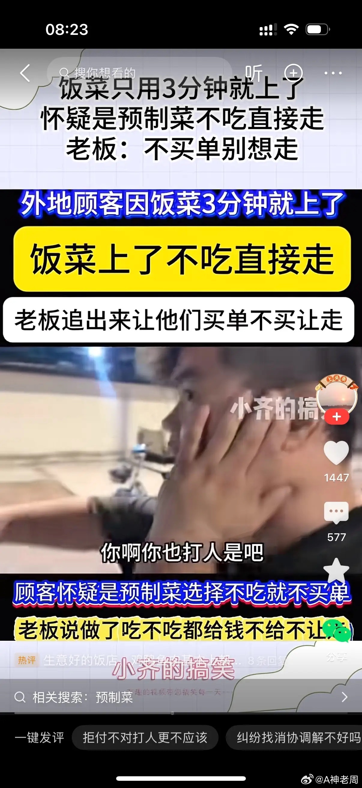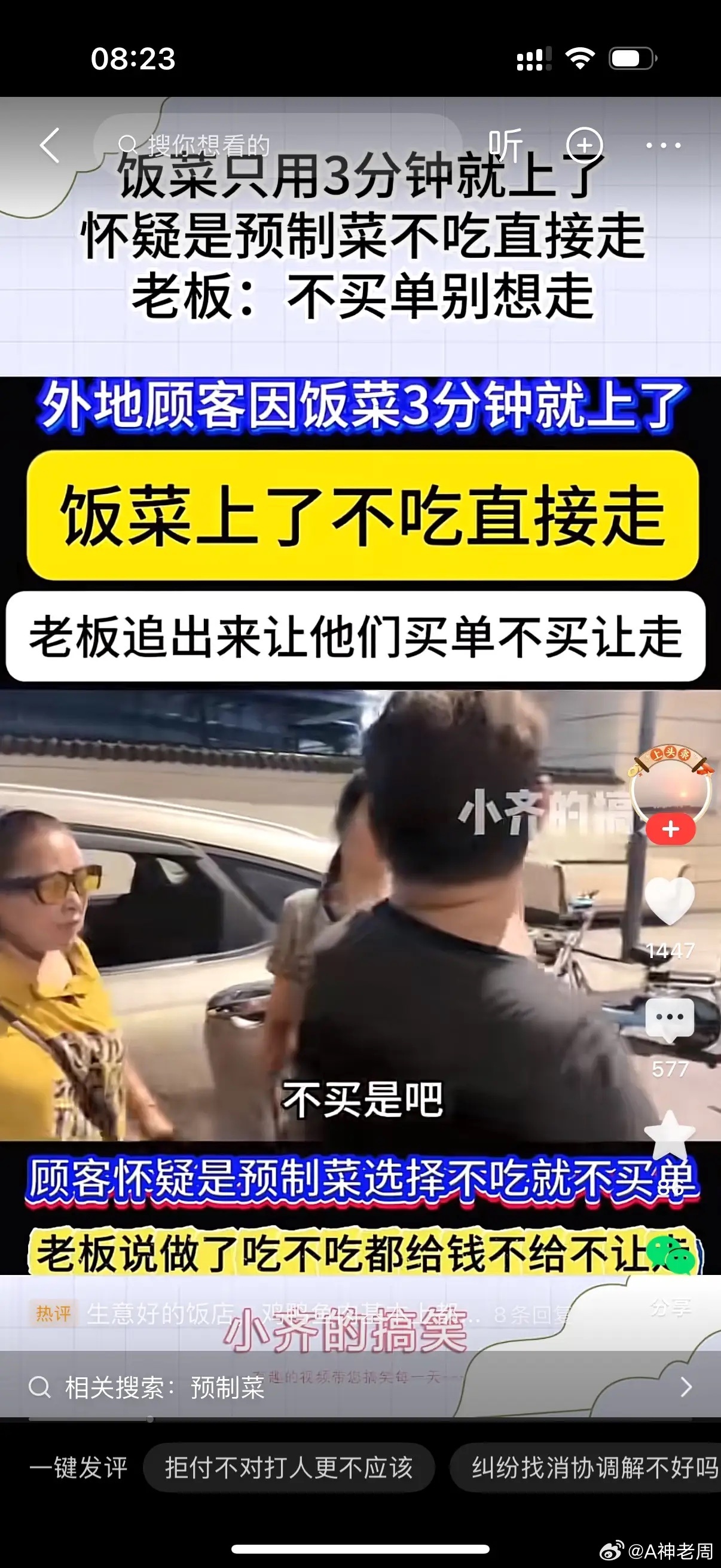 男子三人点了5个菜,有鱼有鸡,结果三分钟不到全上桌了。男子三人认为是预制菜,不吃就直接走人。老板追了出来,问怎么回事?男子说,你做的预制菜,我们不要了。老板说,你不要,也把单买了再走。和男子同行的女人嚷嚷,我们不买。老板一巴掌就呼了过去。男人看自己的女人被打,对着老板就是一拳。就这样两男两女为了预制菜纠缠在一起。