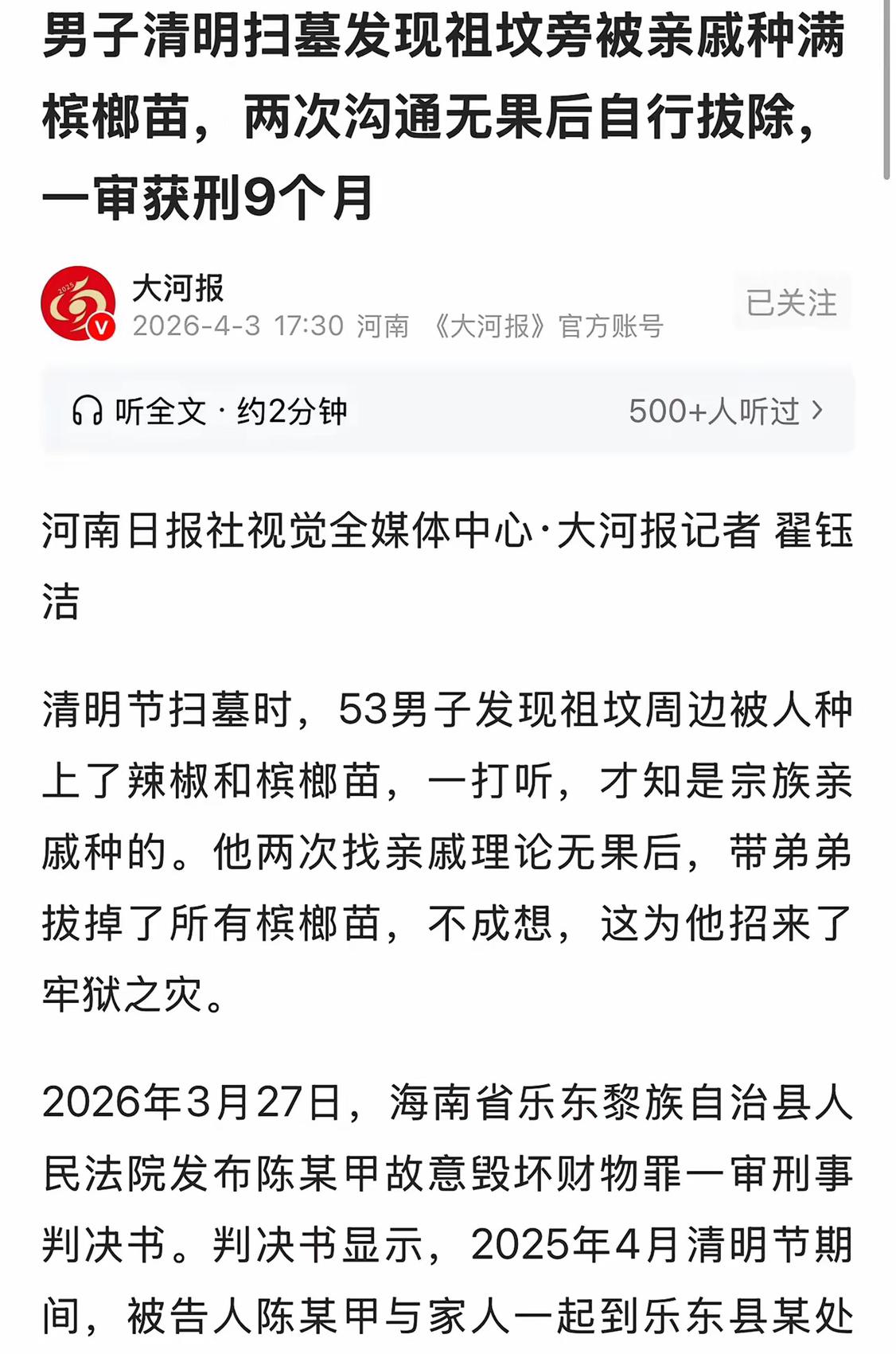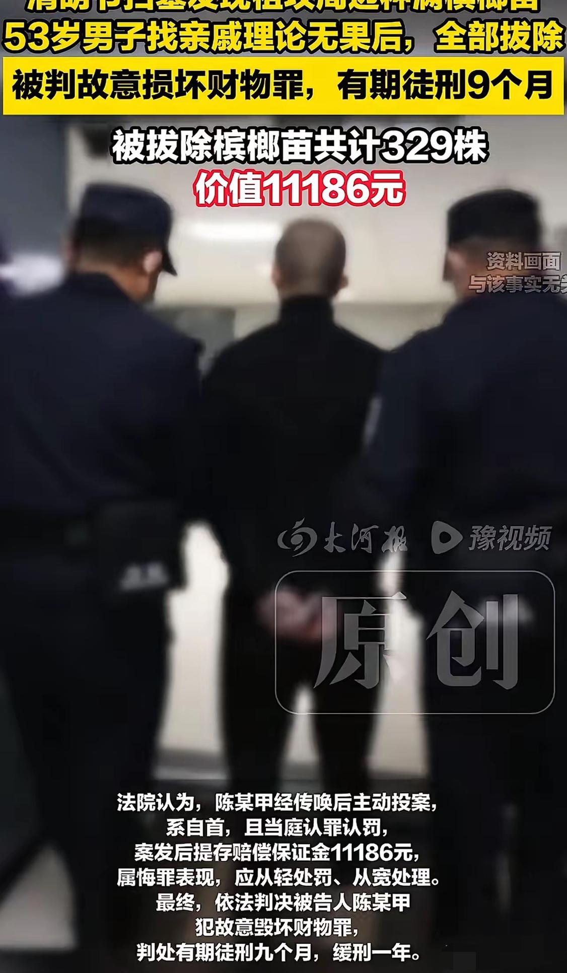 海南,男子清明去扫墓,意外发现祖坟周围被人种满了辣椒和槟榔苗,打听后得知,是一亲戚种的,便上门好言相劝希望自行清除,没想到对方一副种都种了,能奈我何的态度。男子认为对方敬酒不吃吃罚酒,决定给对方点颜色看看,先拔掉了一部分槟榔苗警告,可对方依旧不为所动。男子冲动之下找来胞弟,将329株槟榔苗全部连根拔起,造成损失11186元。亲戚不干了,直接将男子起诉到法院。结果男子被判刑9个月!网友:祖坟多大啊 ?明显是犯法了,300多棵的面积是祖坟?你说拔了旁边的几棵就算了,判得不冤。 去年清明53岁的陈某甲带着家人去给祖宗上坟。到地方发现祖坟四周的空地上,种满了辣椒苗和槟榔苗,绿油油一片。一打听,是同宗的亲戚陈某乙干的。 在海南很多地方,祖坟是家族最看重的精神领地,讲究的是清净、肃穆,让先人安息。周围种上庄稼,尤其是槟榔这种经济作物,在很多老人眼里,是对祖宗的大不敬。感觉就像把先人的安眠之地,变成了自家的菜园子,心里特别不是滋味。 陈某甲找到亲戚,好声好气商量,希望对方能自己把苗清走。可对方根本不理,觉得地是集体的,自己种点东西天经地义,你管不着。这种“种都种了,你能拿我怎么样”的态度,彻底把陈某甲激怒了。 他先自己去拔了一部分苗算是个警告,意思是你把苗弄走,这事就算了。可亲戚看了,照样无动于衷。这下陈某甲火气冲上头,觉得对方是铁了心要欺负人。他叫上弟弟,两人一口气把329株槟榔苗全给拔了,一根没留。 他可能觉得自己是在维护祖宗的尊严,是在主持公道。可他没想到,那些槟榔苗不是杂草,是别人辛苦种下的经济作物,经鉴定损失超过一万一千块钱。这个数在海南已经达到了故意毁坏财物罪的刑事立案标准。 法院最后判了他九个月有期徒刑,缓刑一年。因为他事后主动投案,赔了钱,认了错。法律上这个判决没问题,你毁了别人的财物,价值够数,就得承担责任。 但很多人心里还是觉得憋屈,从情理上看陈某甲好像才是“受害者”。祖坟被人种了东西,沟通无效,被逼急了才动手。亲戚明知那是别人家祖坟,为了点经济利益就去种,是不是也少了点人情味?这背后其实是两套规则的碰撞:一套是千百年来重视祖坟、敬畏先人的民间习俗;另一套是现代法律保护的财产权。 就算你再占理,情绪再激动,维权的拳头也不能砸过法律划的红线。一旦造成较大损失,理亏可能就变成了违法。反过来想,如果当初村里或宗族里有能说话的长辈出面调解,如果双方都能各退一步,是不是就不会闹到对簿公堂、一人获刑的地步? 法律是冰冷的,判得出对错,却量不尽人心里的委屈和传统的规矩。如何在维护法律尊严的同时,也照顾到那些深厚的习俗与情感,是个需要不断琢磨的难题。 各位读者你们怎么看?欢迎在评论区讨论。