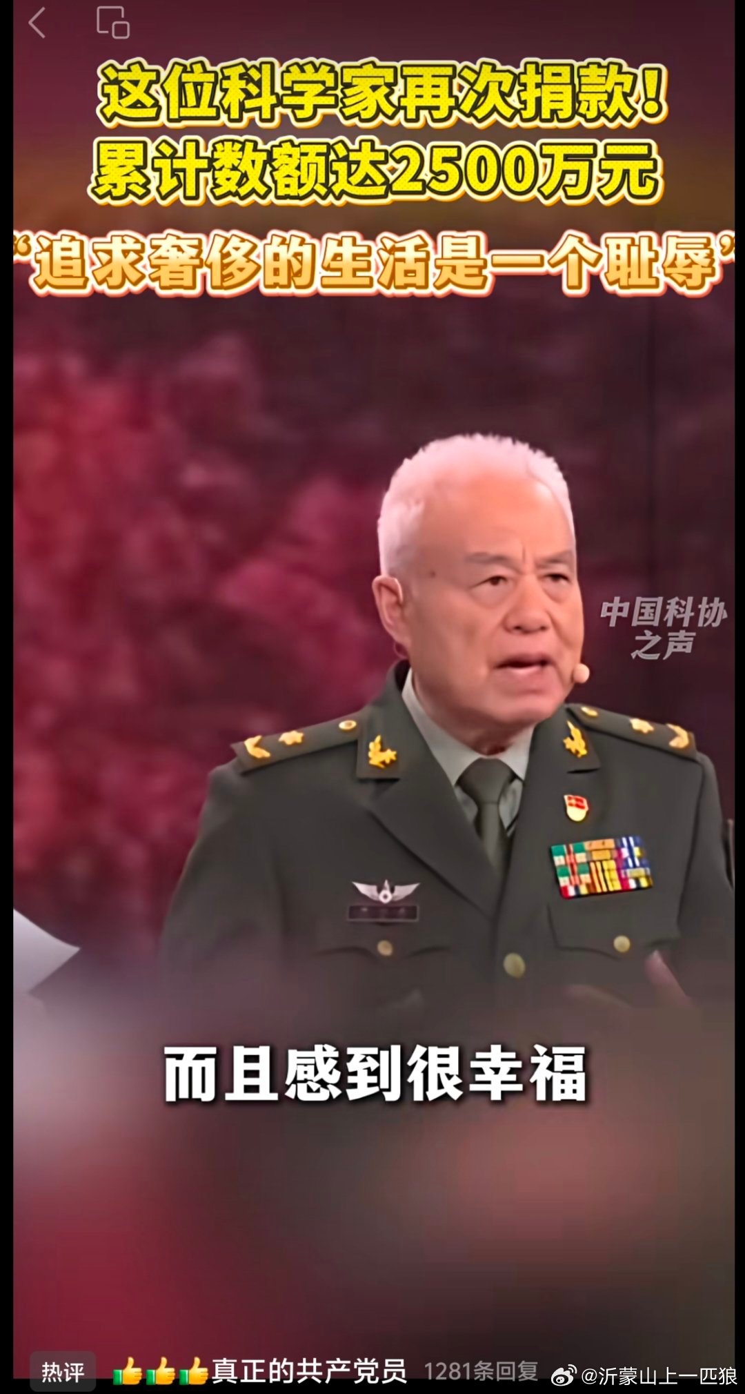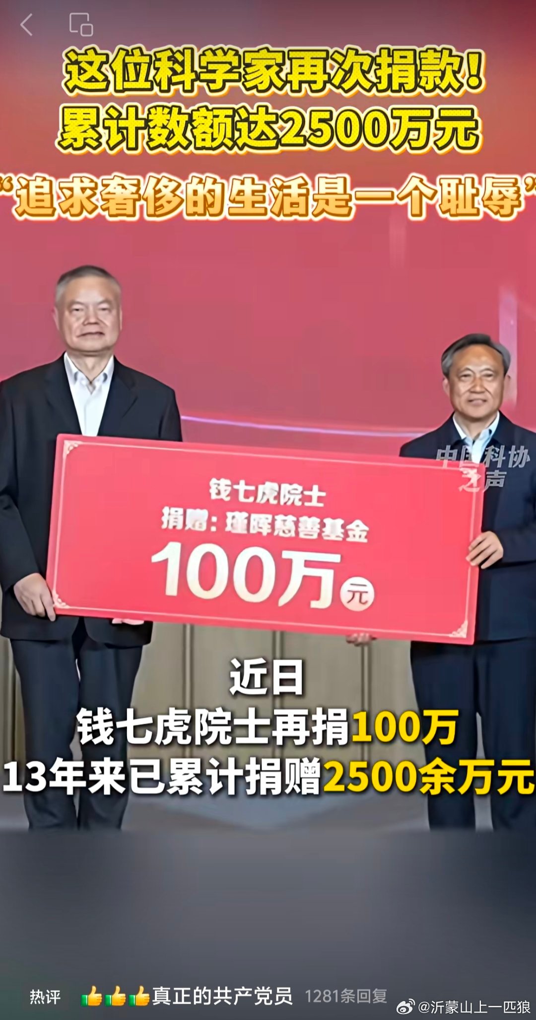 【一个共产党员追求奢侈的生活是一个耻辱!】钱七虎院士再次捐款,累计数额达2500万元。