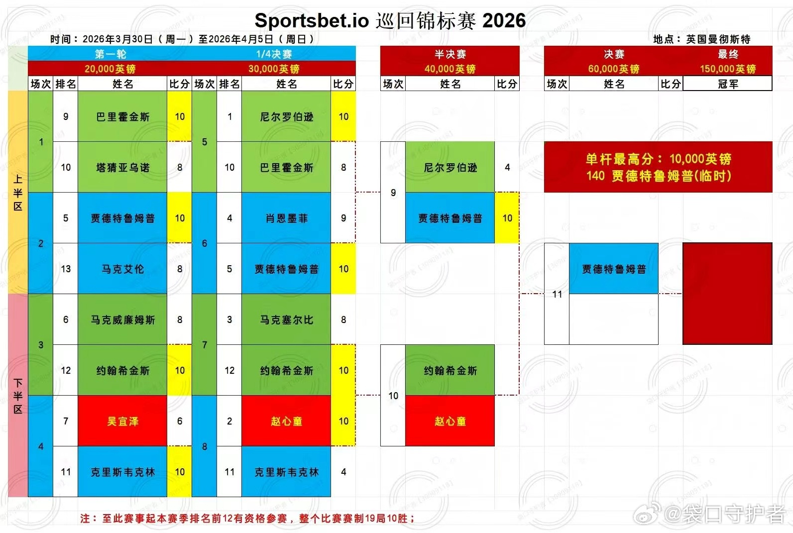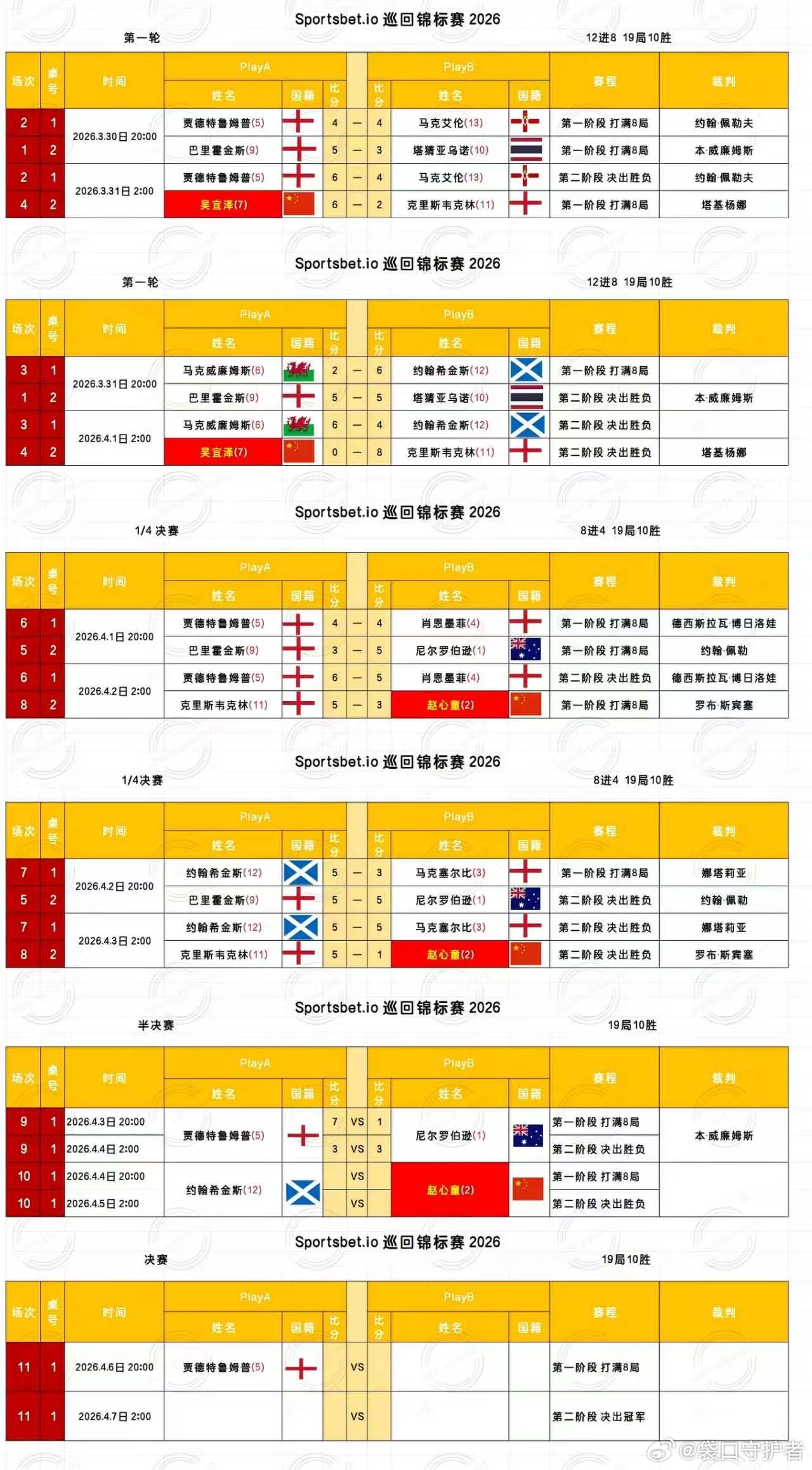 2026斯诺克巡回锦标赛第六天半决赛( 赛制11局10胜)2026.4.4日 星期六20:00 直播: 赵心童V约翰希金斯 第一阶段2026.4.5日 星期日2:00 直播:赵心童V约翰希金斯 第二阶段