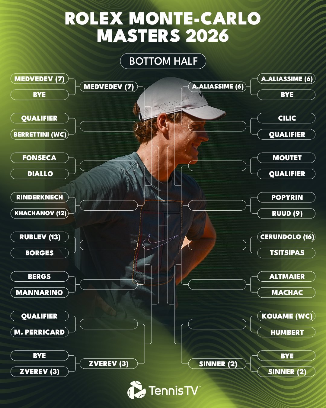 卫冕冠军阿尔卡拉斯将在第二轮迎战瓦林卡和巴埃斯之间的胜者,辛纳的首个对手将在安贝尔和夸梅之间产生。4月12日的男单决赛日,蒙特卡洛能迎来另一场阿卡大战辛纳吗?