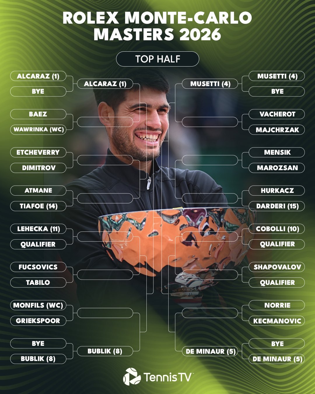 2026赛季蒙特卡洛大师赛公布男单正赛签表,前八种子对位如下:🇪🇸阿尔卡拉斯