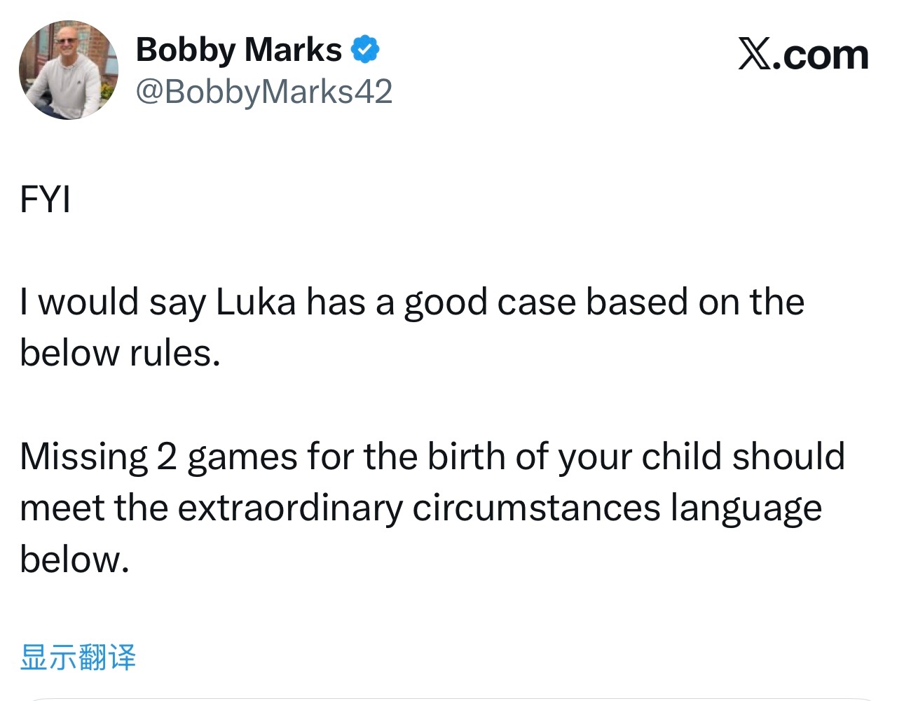 薪资专家Bobby Marks晒出联盟关于“特殊情况豁免”的解释并表示:根据下述规则,我认为卢卡·东契奇具备充分的申诉理由。因孩子出生而缺席2场比赛,应当符合条款中“特殊情况”的相关表述。