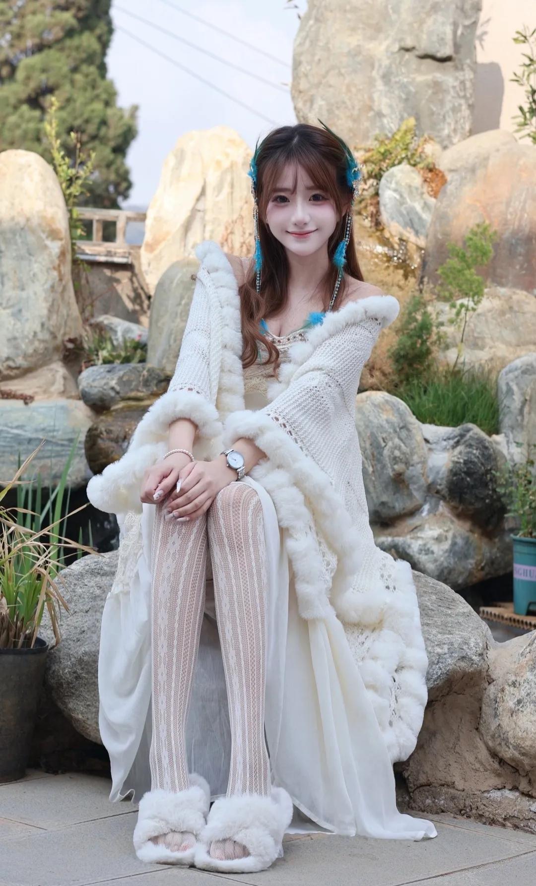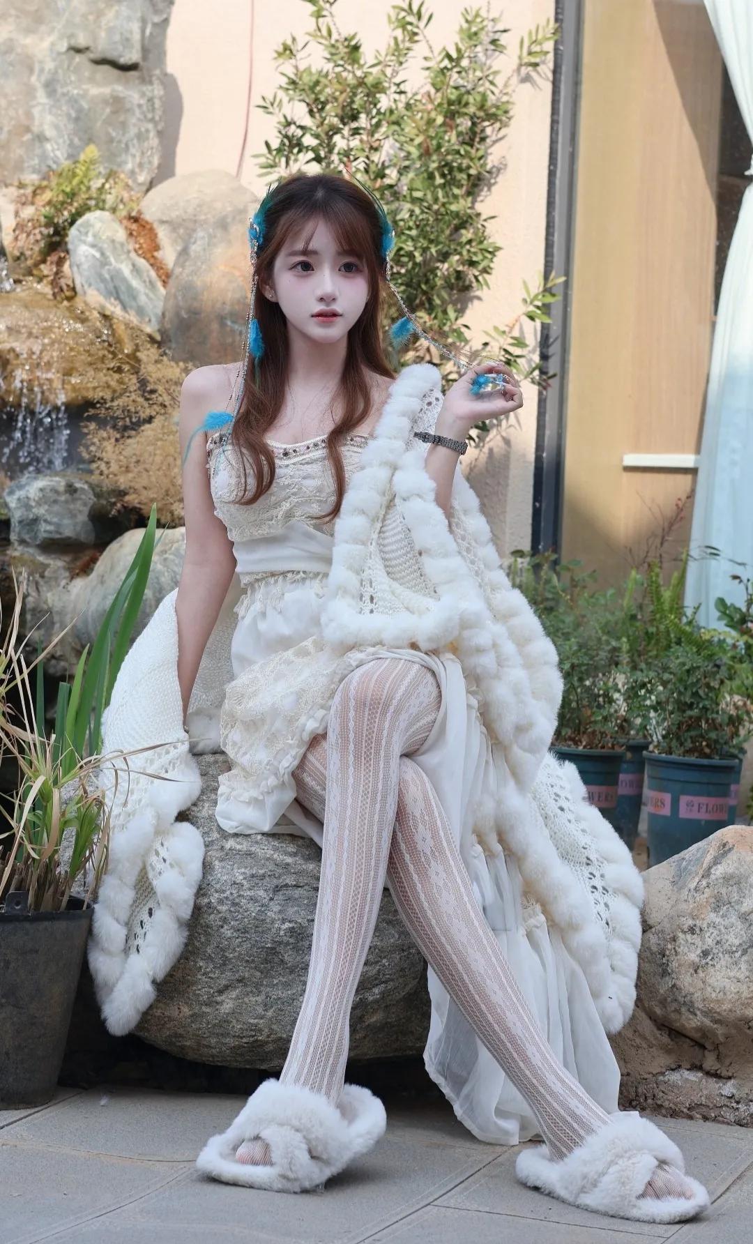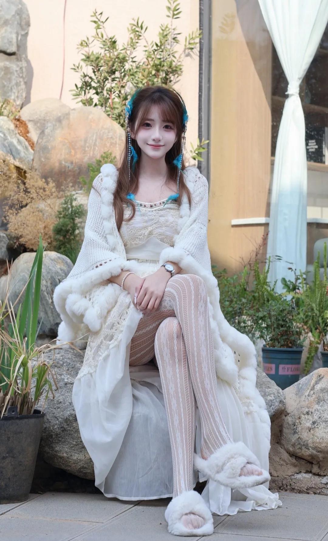 快看啊!这套地域风穿搭直接美到心巴上 谁能拒绝温柔又灵动的地域少女感穿搭!奶白色毛绒披肩+蕾丝吊带长裙,温柔感直接拉满,毛绒边软糯又显贵,蕾丝花纹精致又浪漫,搭配同色系菱格白丝,纯欲感瞬间拿捏。 蓝羽流苏发饰是点睛之笔,灵动又仙气,瞬间把氛围感拉满,仿佛从雪山草原走来的精灵。毛绒拖鞋慵懒又松弛,日常出街、拍照打卡都超合适,温柔中带着一丝野性,甜酷感平衡得刚刚好。 阳光洒在身上,连风都变得温柔,每一帧都像电影截图,这才是属于东方女孩的浪漫氛围感!