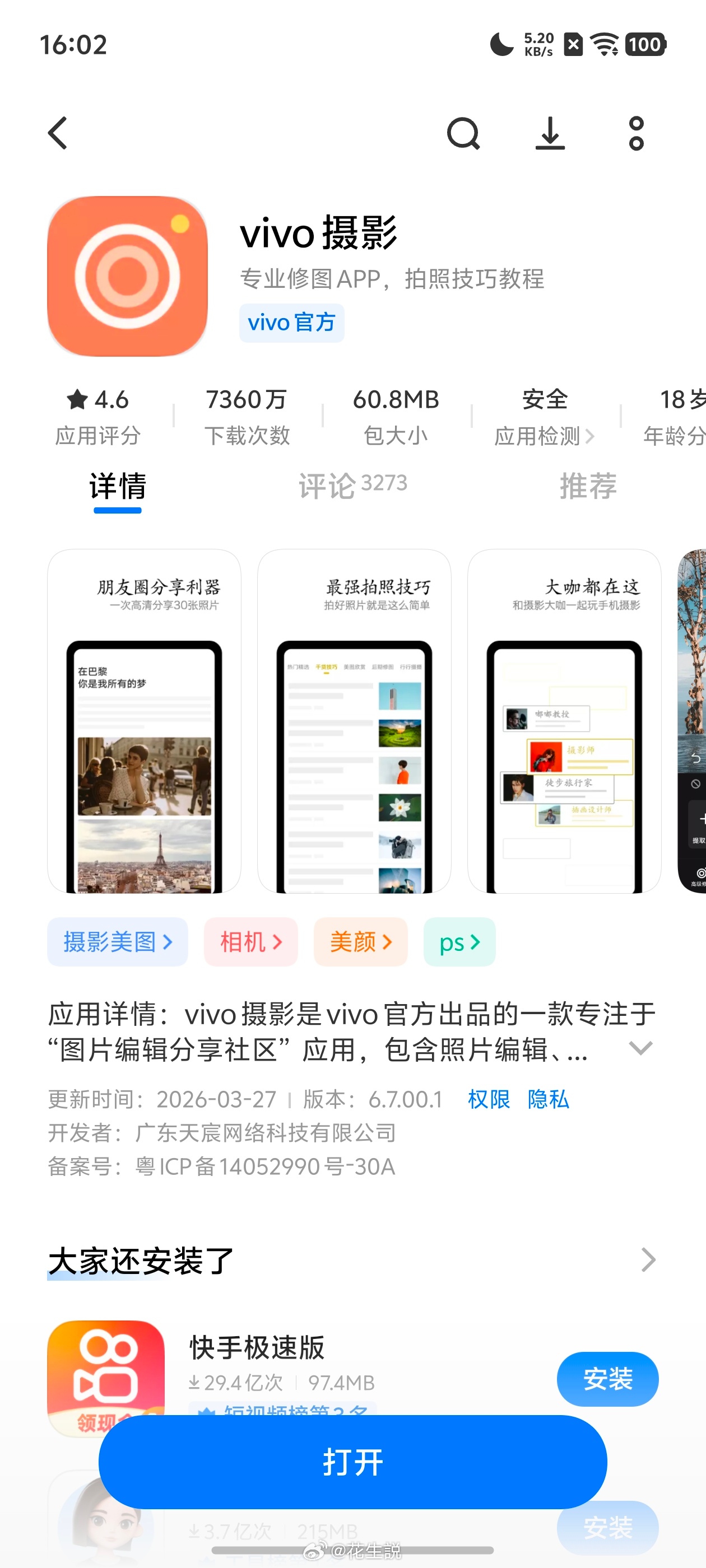 蓝厂有个“vivo摄影”App,里面有美图分享,有各种拍照和录像的教程,而且在这里可以直接修图,如果你想快速提升手机摄影的能力,这个软件很实用啊