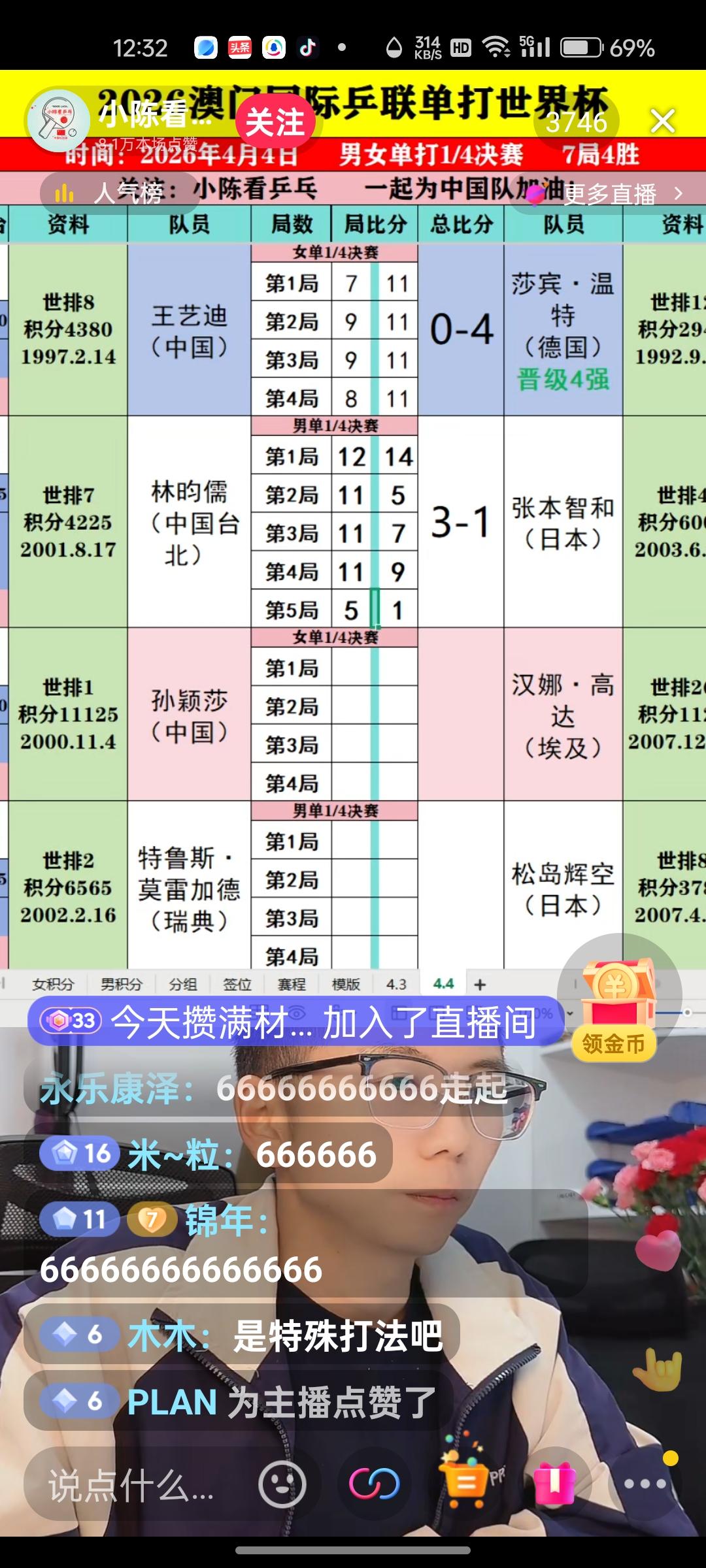 林昀儒4:1淘汰了日本的张本智和,挺进乒球澳门冠军赛男单4强 ! 林昀儒悄悄地。没声没息地涨球了,涨的还吓人啦!弱弱地多个嘴再问一句,现在的林诗栋还能击败林昀儒么! 5局比分,林昀儒,12:14,11:5,11:7,11:9,11:4, 张本宇一家人的澳门世界杯之旅,也完成了,张本宇心里那个难受劲儿啦!!