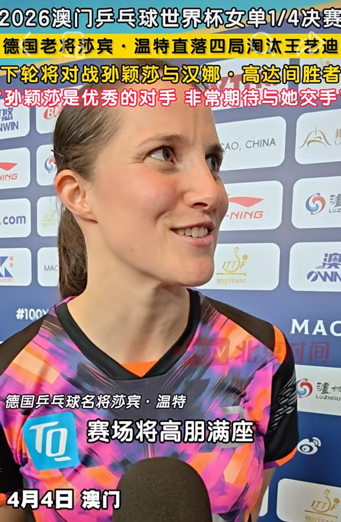 温特:孙颖莎是非常优秀的选手,非常期待与她交手! 4月4日澳门世界杯女单1/4决赛中, 温特4:0王艺迪,晋级女单4强, 温特下一场将对阵莎莎与汉娜高达的胜出者,温特在采访中表示: “下一场如果对阵孙颖莎, 现场气氛将非常热烈, 而且都会为我的对手加油, 尽管如此, 我还是非常期待这场比赛, 这会是一次非常长经验的比赛, 我会尽力争取每一分, 当然,如你们所见, 孙颖莎是更优秀的选手, 而我能做的就是相信我自己, 即使有很小的机会, 我也会努力💪抓住,然后去 享受比赛!” 温特在半决赛一定会遇到莎莎, 感觉温特非常开心, 也会有一些侥幸心理, 但我们都会相信莎莎, 赛前做好困难准备, 加油莎莎!