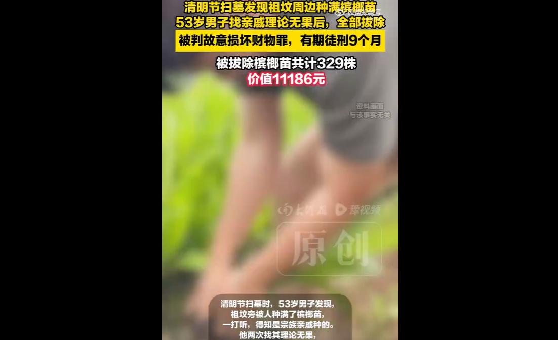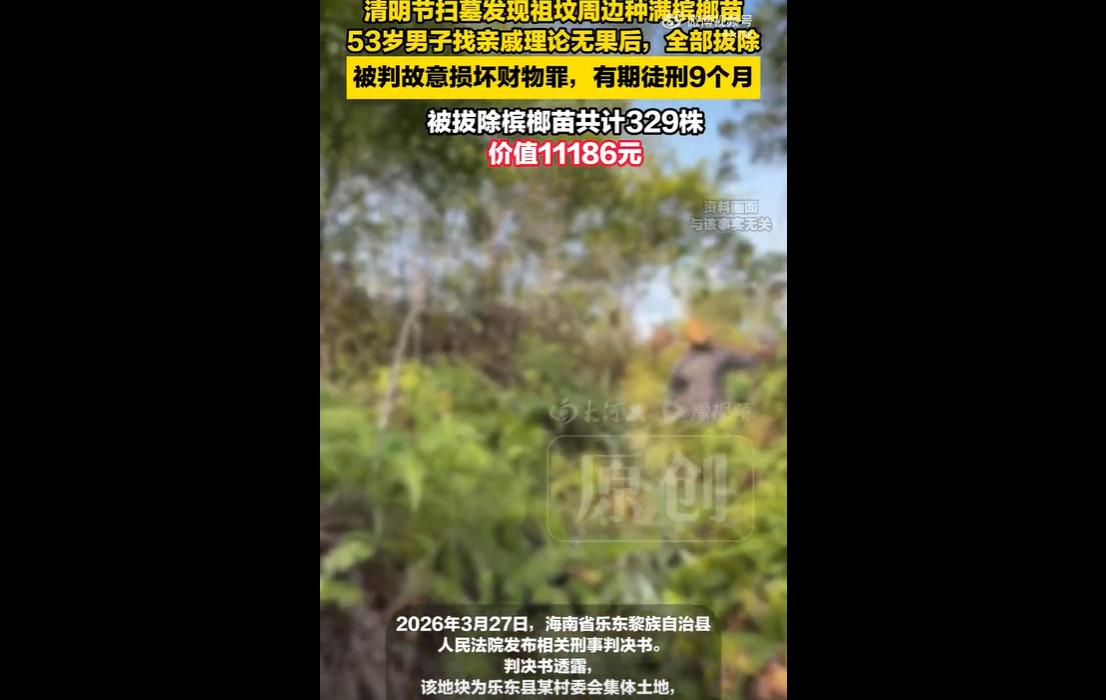 海南 53 岁男子清明扫墓,发现祖坟旁集体土地上被亲戚种了 329 株槟榔苗,协商无果后将苗拔除,涉案价值 11186 元。 法院以故意毁坏财物罪判处其有期徒刑九个月,缓刑一年,男子有自首、认罪认罚及赔偿等从轻情节。 这起因祖坟旁槟榔苗引发的刑事案件,情理与法理交织,既让人理解当事人护坟心切,也提醒我们维权不可越界,遇事需守好法律底线。 清明祭扫本是追思先人、寄托情感的时刻,男子看到祖坟周边被种满作物,心生不悦、上门理论,这份维护祖坟安宁的心情完全可以理解。 在乡土观念里,祖坟周边的环境关乎家族情感,亲戚在旁种植作物,确实容易引发矛盾,也欠缺对他人情感的顾及。 两次沟通未果,男子一时冲动带人拔苗,本意是解决纠纷,却因方式不当触碰了法律红线。 涉案地块属村集体所有,槟榔苗是他人合法财产,被拔价值超万元,已达到故意毁坏财物罪刑事立案标准。 法院综合其自首、认罪认罚、全额提存赔偿保证金等情节,判处缓刑,既体现了法律刚性,也兼顾了案件起因与悔罪表现,量刑较为公允。 很多网友同情男子遭遇,认为 “拔几棵苗不至于判刑”,这背后是情理认知与法律规则的差异。 在法律层面,财产权利受平等保护,即便对方种植行为欠妥,也不能通过私自毁坏财物的方式维权。 正确路径应是向村委、乡镇反映,或通过调解、诉讼解决土地使用争议,私力救济一旦过火,就会从有理变成违法。