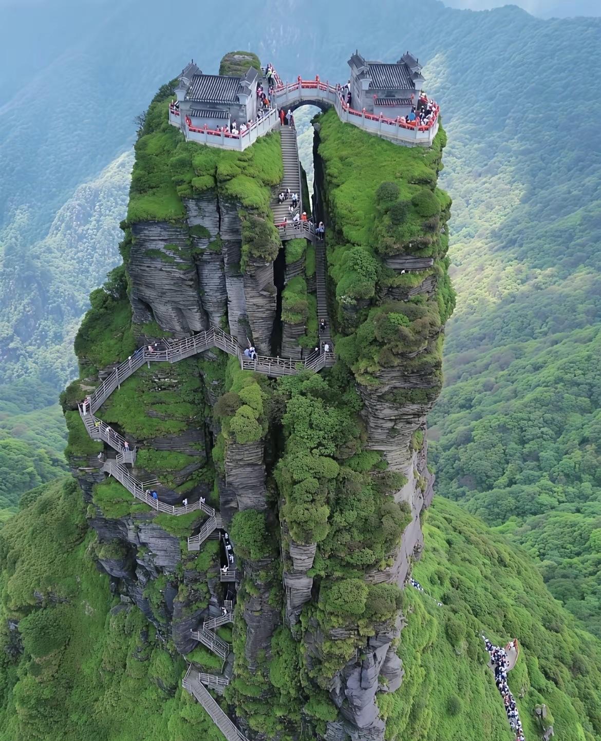 《游天空之城·听梵音静心》 云开金顶见仙宫,石栈盘空路几重。 一桥飞渡烟霞里,恍