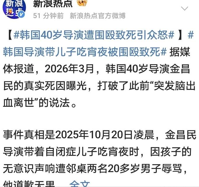 这是韩国娱乐圈最恶心的事了吧! 一个40岁的独立导演,曾是《魔女》系列的艺术指导,在影视圈默默耕耘多年,本是个温和又有才华的创作者,还是独自抚养自闭症儿子的单亲爸爸,谁也没想到,一场深夜的宵夜,会变成他和家人永远的噩梦。 2025年10月20日凌晨,金昌珉带着儿子去京畿道九里市一家24小时餐厅吃猪排,孩子因为自闭症,总会不自觉发出些声响,这本是无法控制的本能,却惹恼了邻桌6名20多岁的醉酒男子。对方张口就骂,语气极其恶劣,金昌珉怕孩子受惊吓,一直低声道歉,想赶紧带孩子离开。 可这群人非但不领情,还步步紧逼,眼看就要动手打孩子,金昌珉立刻把儿子护在身后,自己挡在前面,结果被一拳狠狠砸中面部,当场倒地。 接下来的画面,残忍到让人不敢看。6个人围着倒地的他疯狂围殴,有人锁喉让他窒息,有人对着他的头和胸口猛踢,甚至把他拖到店外继续打,全程金昌珉没有丝毫还手,只是蜷缩着护着自己,嘴里还在哀求“别吓着孩子”。 急救人员赶到时,还被施暴者恶意阻拦,耽误了近一小时的黄金救治时间,等他被送进医院,颅内已经严重出血,一直昏迷不醒。 11月7日,金昌珉被宣告脑死亡,家属遵照他生前的意愿,捐献了心脏、肝脏和肾脏,救了4个陌生人的命,这个一生温柔的父亲,到最后都在用善意回馈世界。 可事发后,家属却对外谎称他是“突发脑出血离世”,不是想隐瞒,而是实在不敢公开。 他们怕消息曝光后,6名施暴者会潜逃,更怕这些人报复,尤其是目睹了全程的孩子,案发后频繁尖叫、情绪失控,家人只能一边承受丧亲之痛,一边默默隐忍,收集证据,就盼着有天能让凶手伏法。 直到2026年3月31日,韩国JTBC电视台公开了监控和目击者证词,4月1日家属又召开新闻发布会,真相才彻底曝光。 可更让人寒心的是司法的态度:警方起初只锁定1名嫌疑人,过了数月才追加第2人,两次向法院申请逮捕令,全被以“嫌疑人住所固定、无毁灭证据风险”为由驳回,至今6名施暴者全没被拘留,依旧正常生活,连一句道歉都没有,甚至有目击者说,他们殴打时还在笑,毫无悔意。 一个保护孩子的父亲,一个捐献器官的好人,被6人围殴致死,凶手却逍遥法外,这样的事发生在法治社会,实在荒谬又讽刺。 金昌珉的老父亲对着镜头痛哭质问“我儿子被打死了,凶手凭什么还能自在走路”,韩国网友也彻底炸了,青瓦台请愿超200万人签名,全网都在为他鸣不平。 这事之所以让人愤怒,不只是因为一场无端的暴力,更是暴力之后的冷漠、司法的偏袒,和对生命的漠视。 金昌珉的悲剧,不只是一个家庭的伤痛,更撕开了韩国社会某些阴暗的角落,让人看清有些时候,普通好人的命,在特权和不公面前,竟如此轻贱。 如今事件还在发酵,只盼着舆论能倒逼正义,让这6个施暴者付出应有的代价,告慰金昌珉的在天之灵,也给那个失去父亲、留下一生阴影的孩子,一点点迟来的交代。