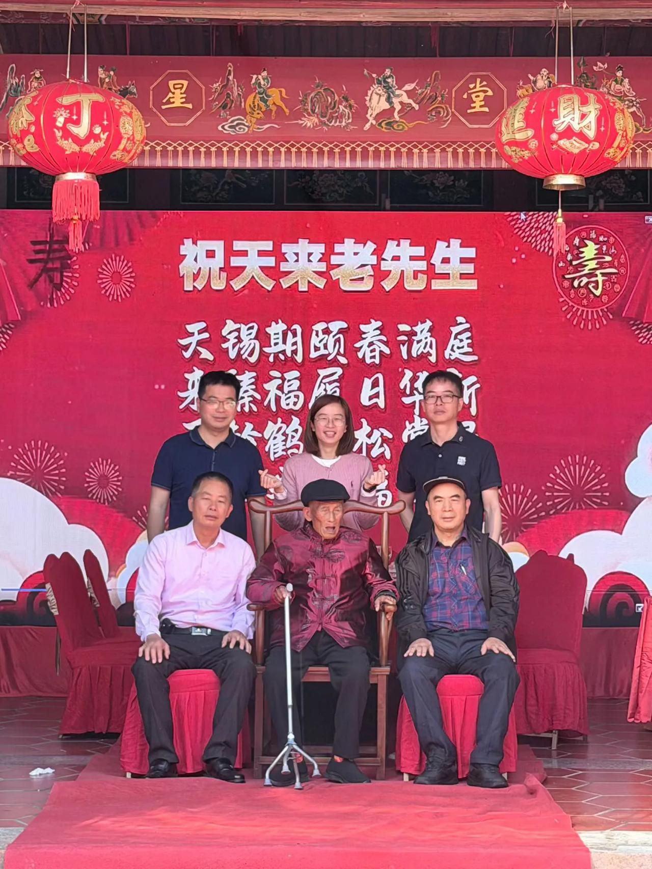 天来老师登百龄 芬芳桃李誉满乡 梓里崇学蔚成风 孙完渊谋天来先 世纪福寿且举杯 作育学生功无量 --贺赖天来老师百龄大寿