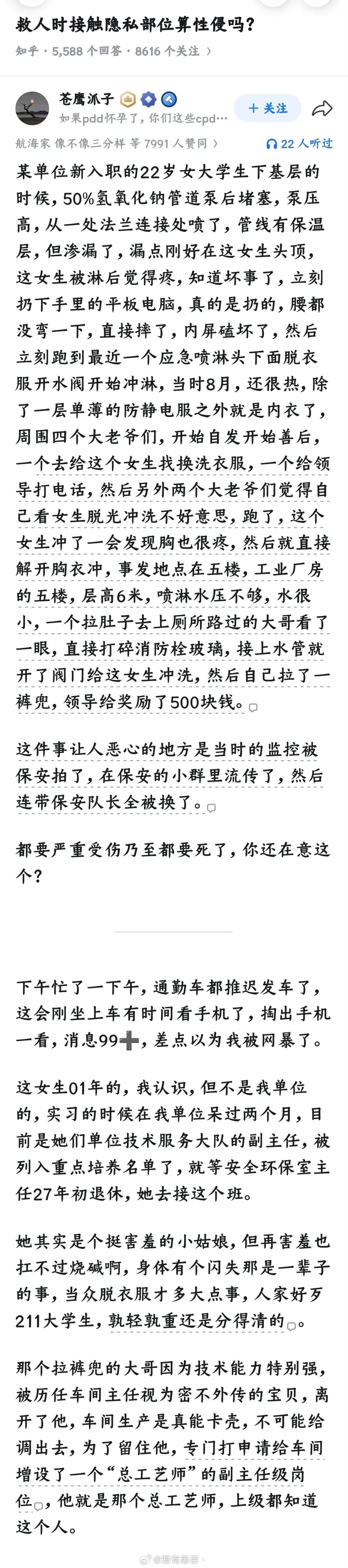 我记得以前知乎有个被硫酸蒸汽喷到的,4个人都是立马脱光冲,就一个大妈脸皮薄去淋浴