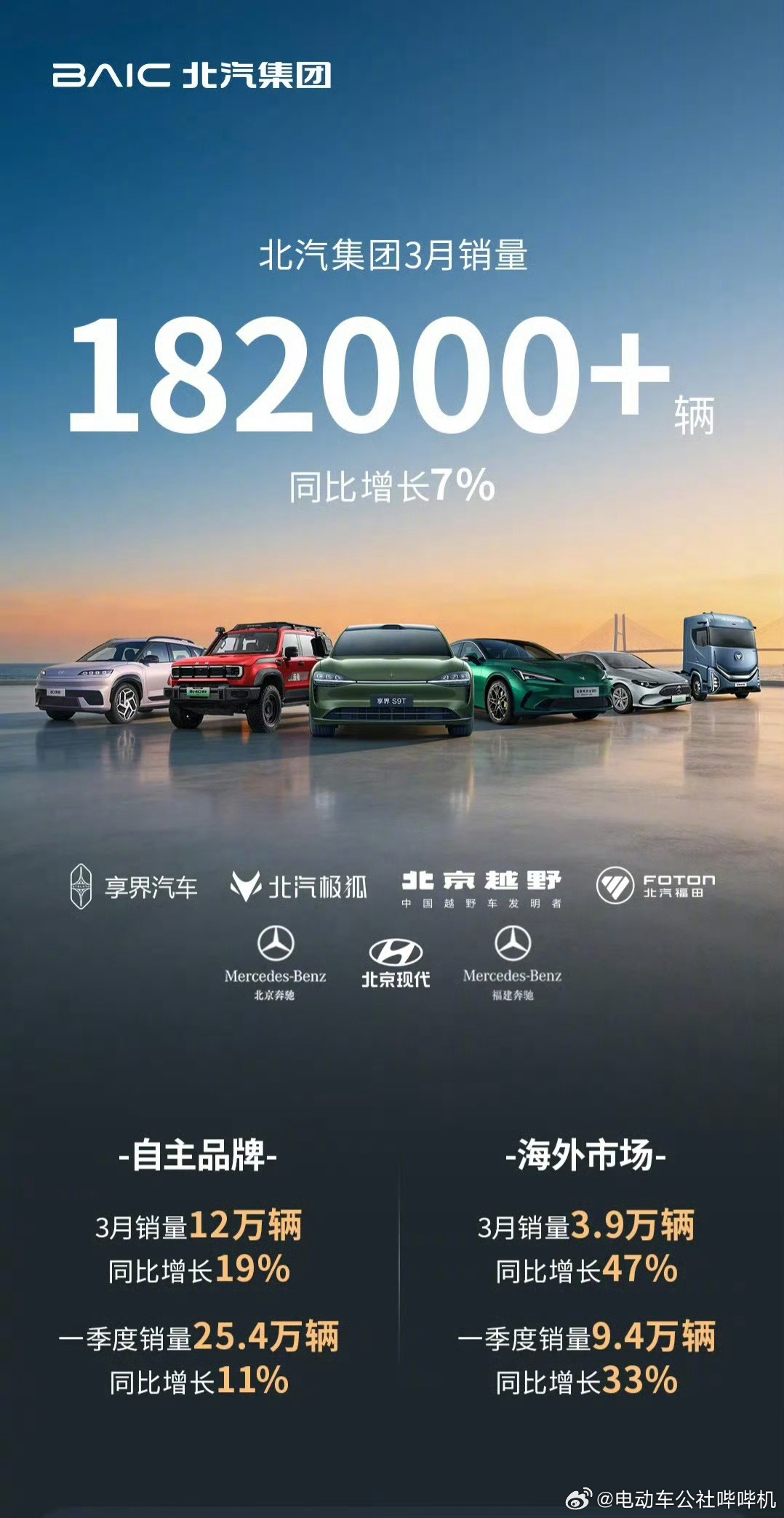 北汽集团3月份销量超18.2万辆,同比增长7%,一季度累计销量超过40万辆,超过