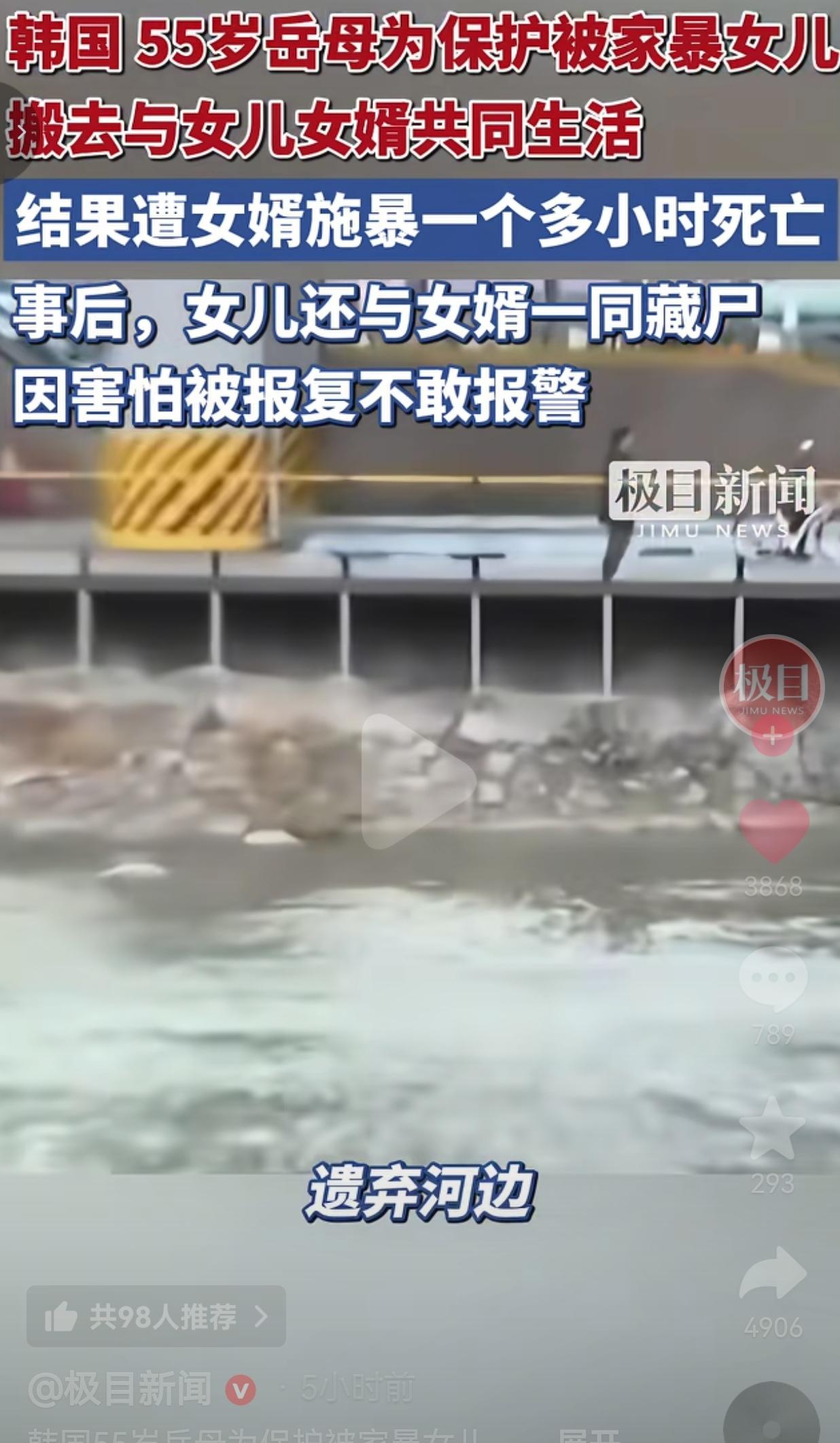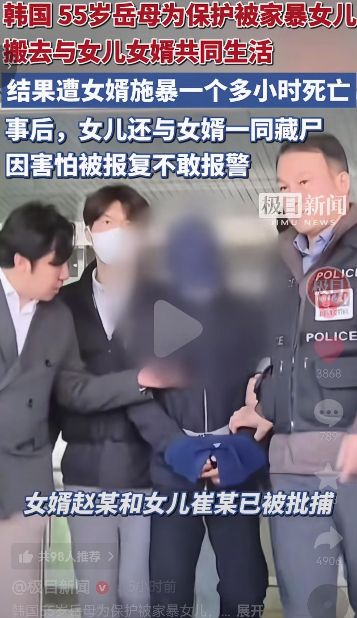 气到浑身发抖!为了保护女儿不受家暴,55岁的亲妈毅然搬进女儿女婿家撑腰,结果竟被女婿殴打致死,而被妈妈拼尽全力守护的女儿,居然转头帮着凶手一起藏尸,就因为怕丈夫报复自己! 据媒体4月3日报道,韩国发生了一起让人无比痛心、三观震碎的家庭惨案,看完每一个细节都让人揪心。 55岁的崔妈妈,看着女儿长期被女婿赵某家暴,心疼得夜夜难眠,看着女儿遍体鳞伤的样子,她心里比自己挨打还疼。 为了给女儿撑腰,不让她再独自承受暴力,也想着有长辈在家,女婿能收敛几分,崔妈妈没多想,毅然收拾行李搬进了女儿的家,只想守着女儿,护她一世安稳。 可她万万没想到,自己这份沉甸甸的母爱,竟成了催命符。 赵某早就对妻子家暴成性,更是极度反感岳母的介入,觉得老人碍了自己的事,甚至找了“岳母在家制造噪音、不整理物品”这种荒唐又可笑的借口,对着55岁的崔妈妈持续施暴,下手毫无分寸,最终导致老人不幸身亡。 更让人毛骨悚然、心寒到骨子里的是,亲眼看着母亲遭遇不幸的女儿崔某,没有第一时间打电话报警,没有向外界呼救,心里想的不是为惨死的妈妈讨公道,而是害怕被丈夫报复,选择了助纣为虐。她和丈夫一起,把妈妈的遗体装进行李箱,开车运到河边遗弃,就为了帮丈夫掩盖这桩滔天罪行,妄图瞒天过海。 直到市民偶然发现遗体,警方介入全面调查,这起泯灭人性的惨案才彻底浮出水面。 目前,施暴女婿赵某和帮凶女儿崔某,均已被警方依法批捕,等待他们的必将是法律的严惩。 网友看到后评论说:我真的服了!这女儿是被打傻吓傻了吗?亲妈为了护你丢了性命,你转头就帮凶手藏尸抛尸,你妈这辈子真是白养你一场啊! 也有的网友说:这女婿也太恶毒了!家暴老婆已经是犯罪了,连护女的老人都下死手,简直没有人性,必须重判绝不姑息! 还有的网友说:最让人寒心的不是施暴的丈夫,而是这个帮凶女儿!妈妈用命护你周全,你为了自己苟活背叛亲妈,这心也太狠了! 也有的网友:妈妈拼了命拉你出深渊,你自己偏要往火坑里跳,还把最爱你的妈妈推下去,真是太让人心寒了! 我真的替这位55岁的妈妈不值! 这个女婿赵某,行为早已突破人伦底线,家暴妻子本就是不可饶恕的大错,面对前来保护女儿、毫无反抗之力的岳母,不仅不知悔改,反而施以暴行致其死亡,这是严重的违法犯罪行为,必须受到法律最严厉的制裁,半点都不能纵容! 而最让我寒心、最无法接受的,是女儿崔某的选择! 我能理解长期深陷家暴困境,会让人陷入极度恐惧、变得懦弱胆小,我也能共情她长期被暴力对待的无助与绝望,但我永远无法原谅她的背叛与冷漠! 妈妈为了她,放弃自己安稳的生活,义无反顾踏进这个充满暴力的牢笼,不过是想给她撑腰,给她一份安全感,想让她不再受欺负。 可结果呢?她亲眼看着妈妈被丈夫施暴致死,第一反应不是救妈妈,不是报警讨公道,而是怕自己被报复,帮着凶手藏尸抛尸,把妈妈的遗体随意弃之荒野! 这已经不只是恐惧,而是极度的自私与冷漠,亲手辜负了世界上最愿意为她付出生命的母亲。 她的懦弱从来不是开脱的理由,而是帮凶的铁证;她的沉默不是无奈,而是助纣为虐的犯罪! 妈妈用命为她换来的生机,被她亲手葬送,还把母亲的遗体当成了自己苟活的垫脚石,这种选择,真的太让天下父母寒心了! 这起血淋淋的惨案,给所有身处家暴困境的人,给所有疼爱子女的父母,都敲响了振聋发聩的警钟。 父母永远是孩子最坚实的后盾,为了孩子,他们愿意拼上自己的一切,甚至付出生命的代价,这份爱纯粹又伟大,容不得半点辜负。 但我们绝不能把这份沉甸甸的爱当成理所当然,更不能让拼了命爱我们的人,为我们的懦弱、妥协和逃避付出生命的代价。 永远要记住,家暴只有0次和无数次,面对恶魔般的施暴者,妥协和忍让从来换不来平安与救赎,只会换来对方变本加厉的伤害,甚至会连累身边最爱你的人。 而那些在暴力中选择沉默、选择依附、选择背叛亲人的人,即便暂时苟活,也终将被良心谴责,被世人唾弃,一辈子活在愧疚与悔恨之中,永远无法原谅自己。 妈妈用命护你周全,你却用背叛辜负深情,这世间最寒的,莫过于真心被错付、亲情遭践踏! 信息来源:极目新闻