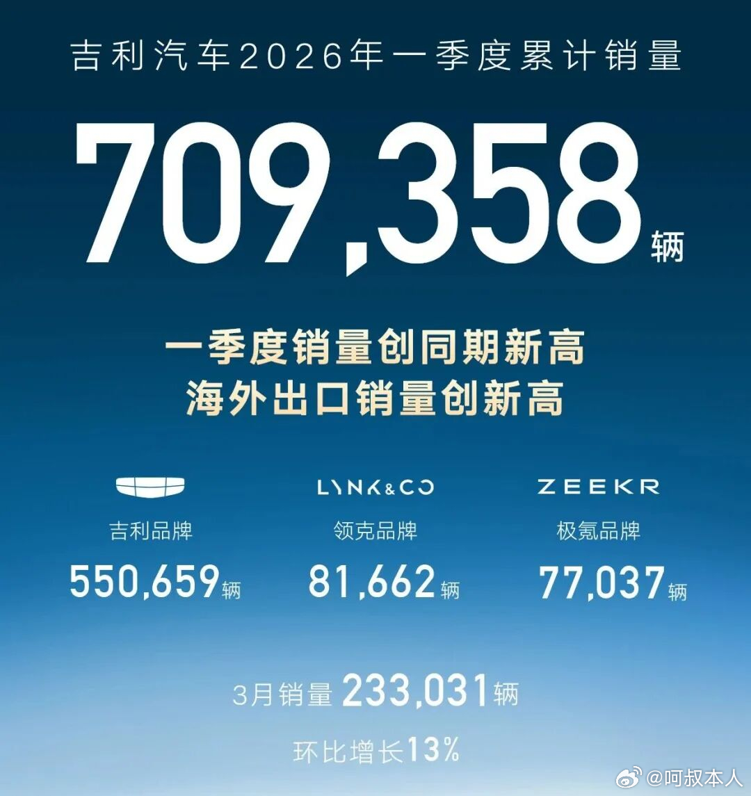 国产车老大的宝座换人了!今年第一季度吉利以70.9万辆微弱反超比亚迪的70万辆,这还不是谁突然就强了,其实这两家的模式本来就不一样,吉利是油电并行,新能源占比52%,比亚迪是All in新能源,而且出口占比接近46%,更激进。一季度前两个月吉利领先,但3月比亚迪直接用30万辆反扑,单月又拉开6.7万辆,这说明双方之间是高手过招,在不同阶段此消彼长。有一点就是,吉利的油车现在卖的很好,而且混动系统也很全,比如除了传统的插混和纯电,吉利很早就布局了HEV,现在的i-HEV直接给这套油混系统加入了AI,所以能效超过了日系传统HEV,但从油电两条腿走路来说,吉利是更有优势的。