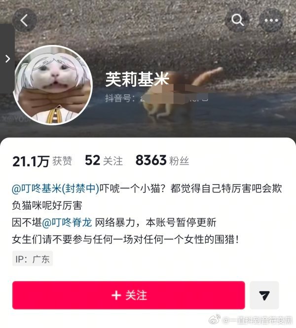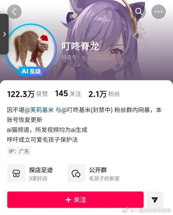 【虐///猫】此人账号盗用(不知道是真人coser还是ai)照片作为视频封面,视频内容全是清一色的猫咪4️⃣//👑或者虐///猫内容,主页有疑似虐//猫群的粉丝群,plq也特别恶臭,视频还是小火人推给我朋友的