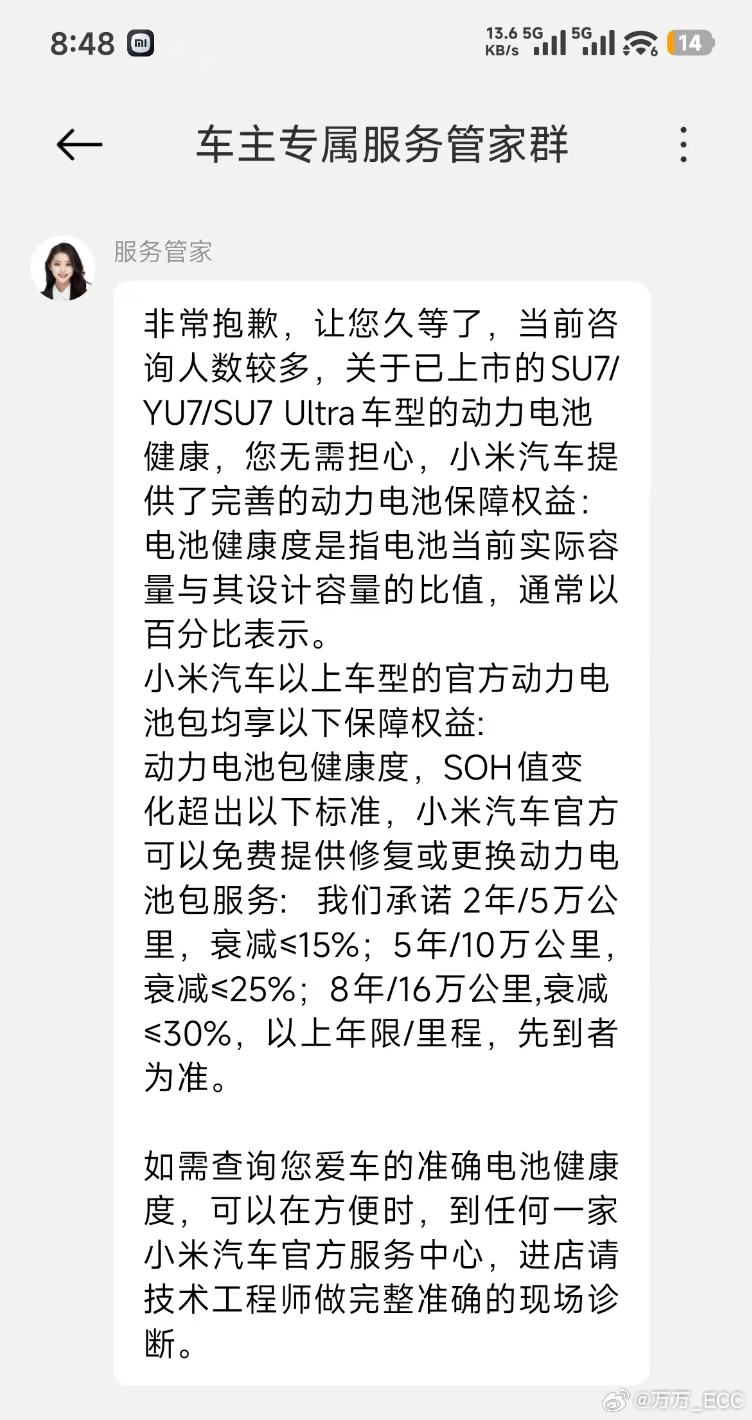 这里还有小米官方的电池衰减质保条件:2年/5万公里,衰减≤15%;5年/10万公里,衰减≤25%;8年/16万公里,衰减≤30%,在里程和年限内大于这个值都可以质保。