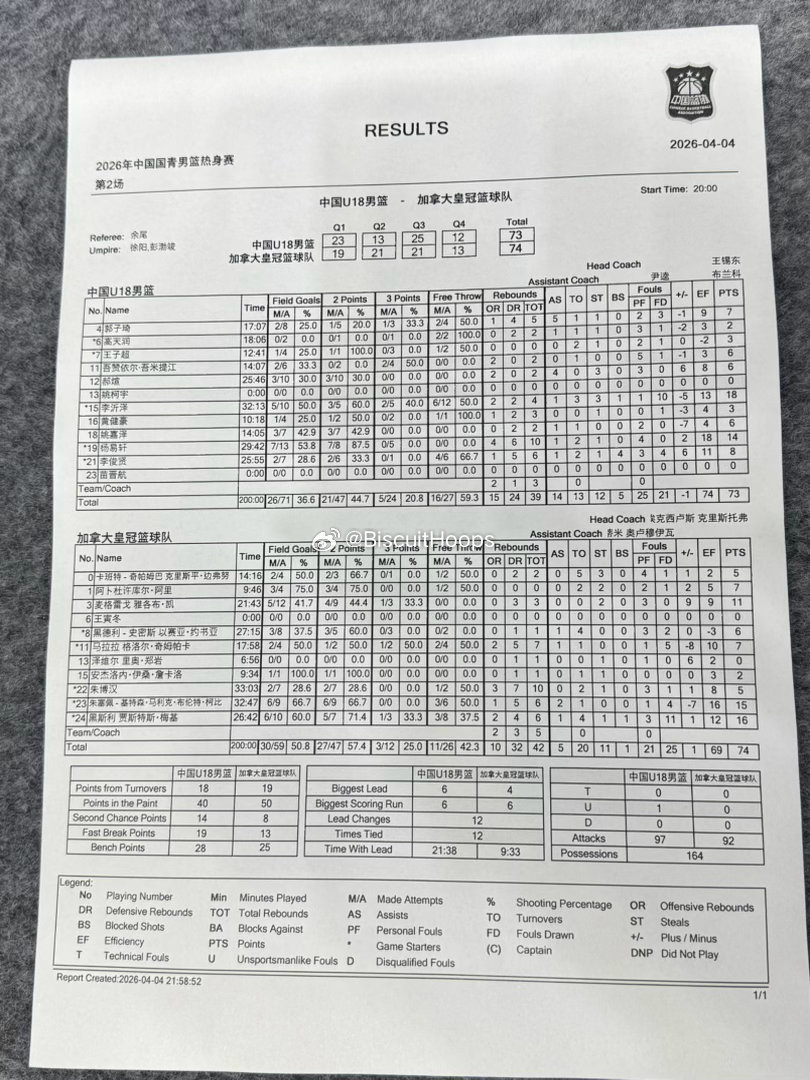 中国U18男篮73-74惜败加拿大皇冠高中,数据统计如下。u18国青