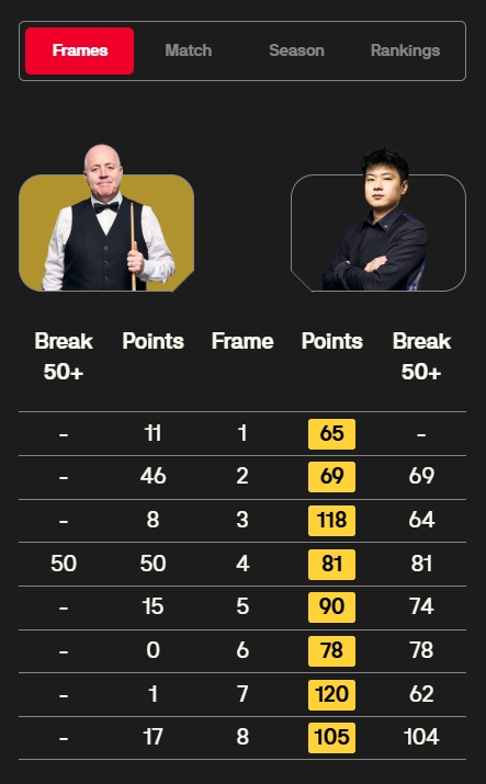 赵心童状态极佳,接连打出单杆69、64、54、81、74、78、58、62、104分,直落八局8-0领先约翰·希金斯结束第一阶段。