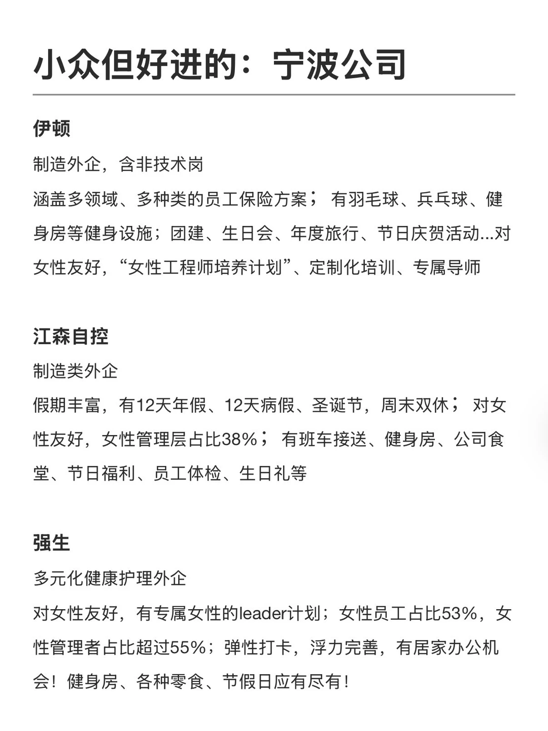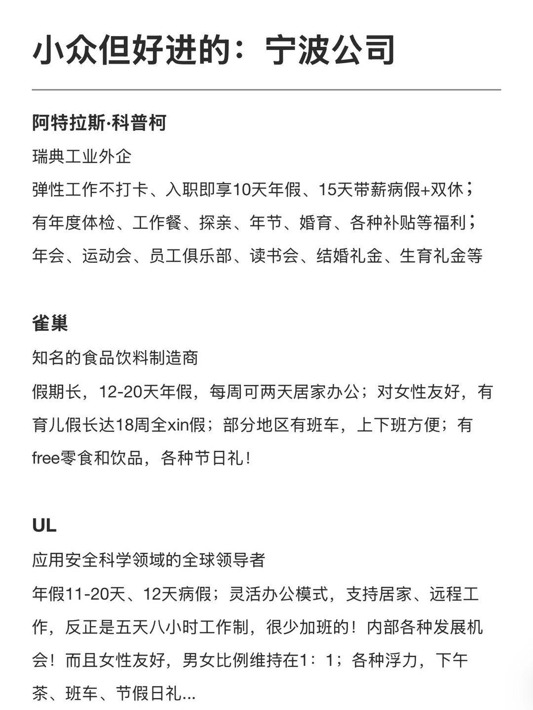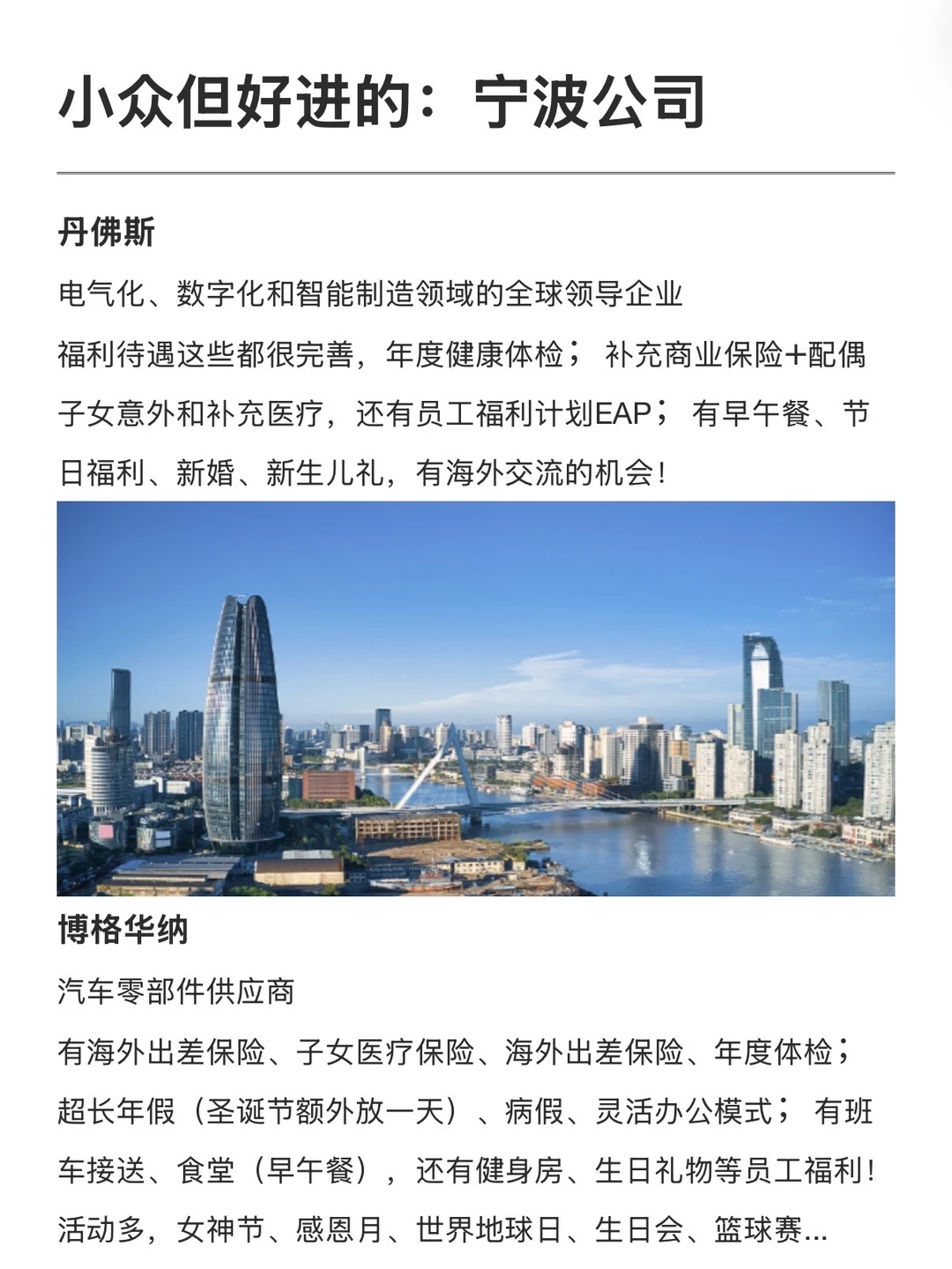 宁波发展真的越来越好,有不少小而美、冷门宝藏的公司 尤其是金三银四,机会真的很多! · 很多外企在宁波都设有分公司/办事处,有些是地区岗位 所以大家真的可以去尝试进宁波外企 · 大家不要觉得外企很难进 其实外企也有一些常规类、英语要求没有那么高的岗位 · 为什么还是值得去外企? ▪️氛围好,对女性友好,年假长,平均年假都是15天 ▪️还支持居家办公、福利完善,是真的能实现WLB ▪️待遇也还不错,这段时间找工作的真的可以考虑考虑~ · 坚持日更,帮大家在找工作路上顺利拿 offer! ·