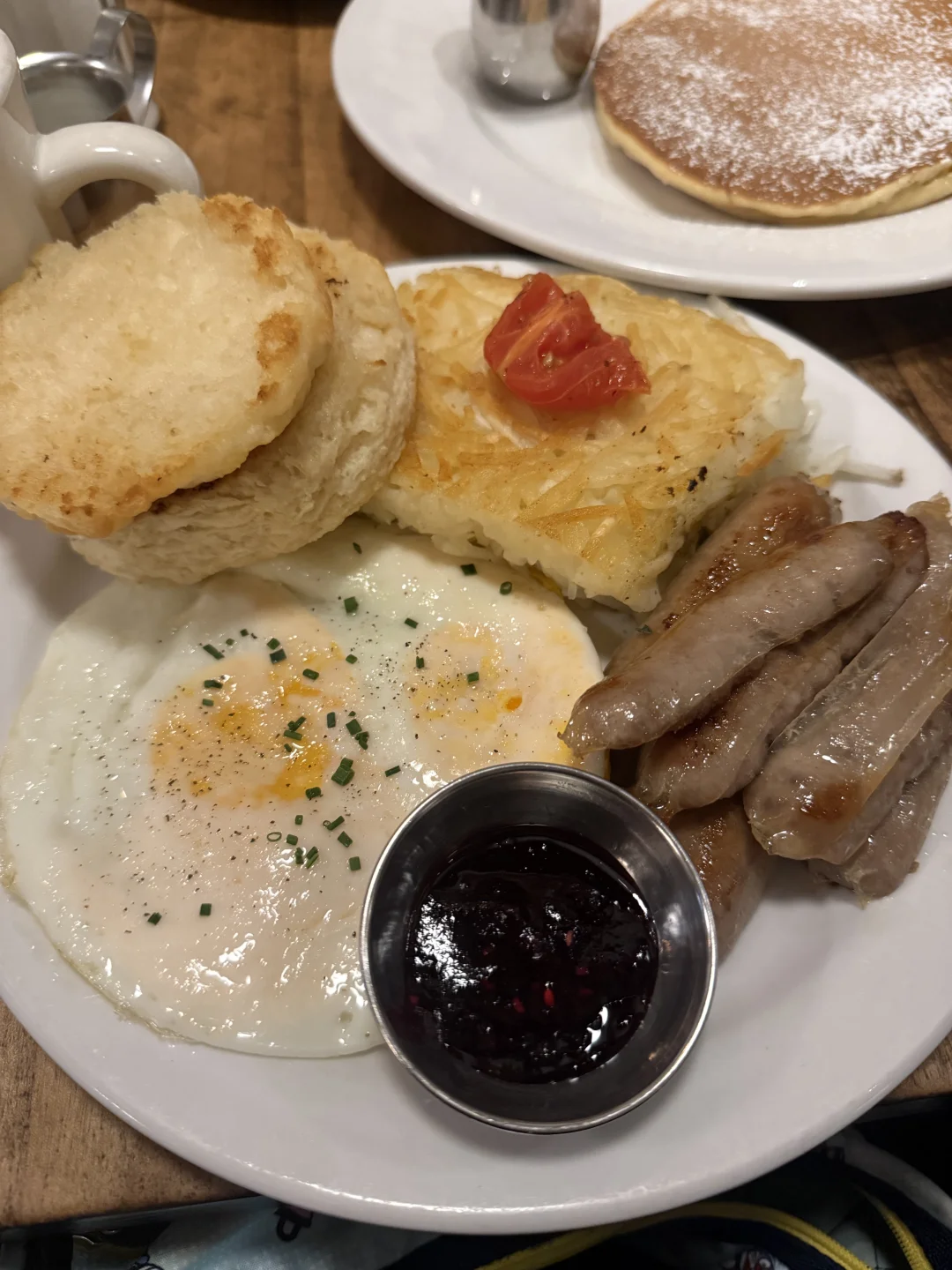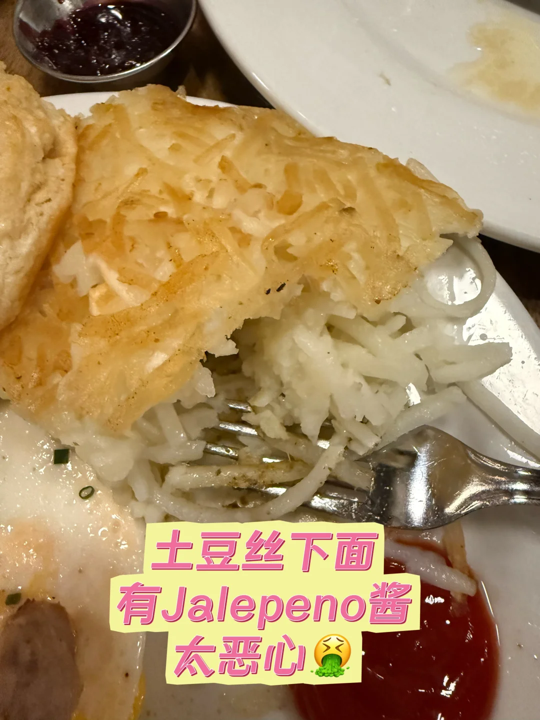 [种草R]【传统早餐盘】鸡蛋ok,只要全熟就可以,两种面包都很难吃,不过也可以吃,最难以接受的是这个炸土豆丝下面的酱,真的是一口🤮,原谅我真的不能接受Jalepeno这种调料