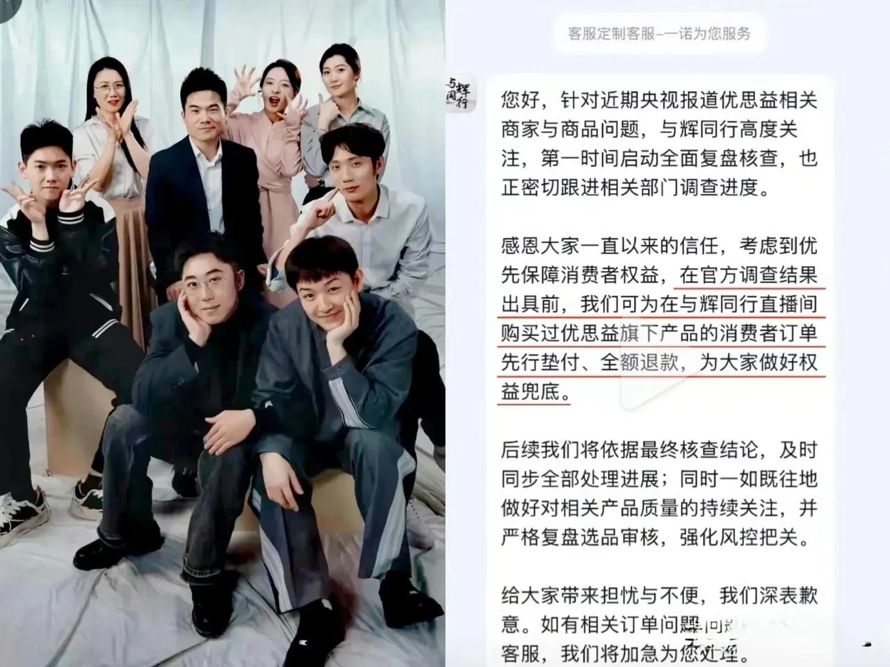与辉同行这次被优思益坑惨了。网传与辉同行曾在直播间说过每月花百万检测产品,并派员工实地考察工厂,而央视却曝光优思益在澳洲的生产基地却是汽车维修厂,可见与辉对工厂的考察并不严谨,而是有纰漏。另外,优思益出事后,与辉同行第一时间出来攻关,承诺全额退款,并且是“先行垫付”,但食品安全法还规定,“生产不符合食品安全标准的食品或者经营明知是不符合食品安全标准的食品,消费者除要求赔偿损失外,还可以向生产者或者经营者要求支付价款十倍或者损失三倍的赔偿金”;网传的与辉同行售卖的优思益价值千万,因此,这事就难办了,如果按十倍赔偿,与辉同行就会大出血,如果仅全额退款不赔偿,会不会对与辉同行的信誉与口碑带来重大影响?