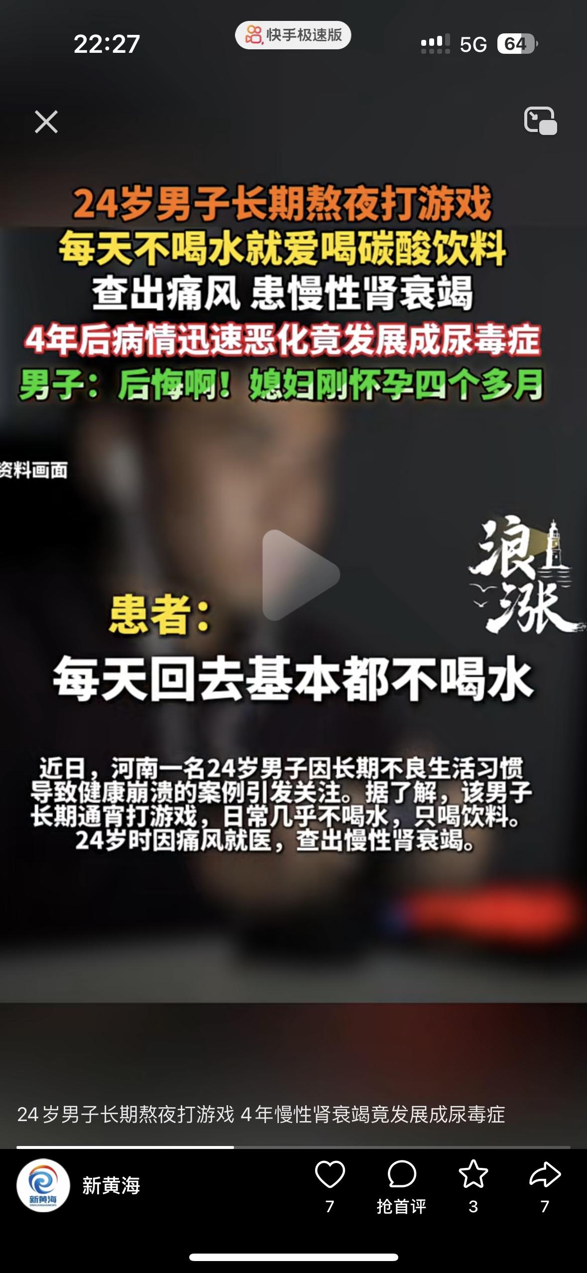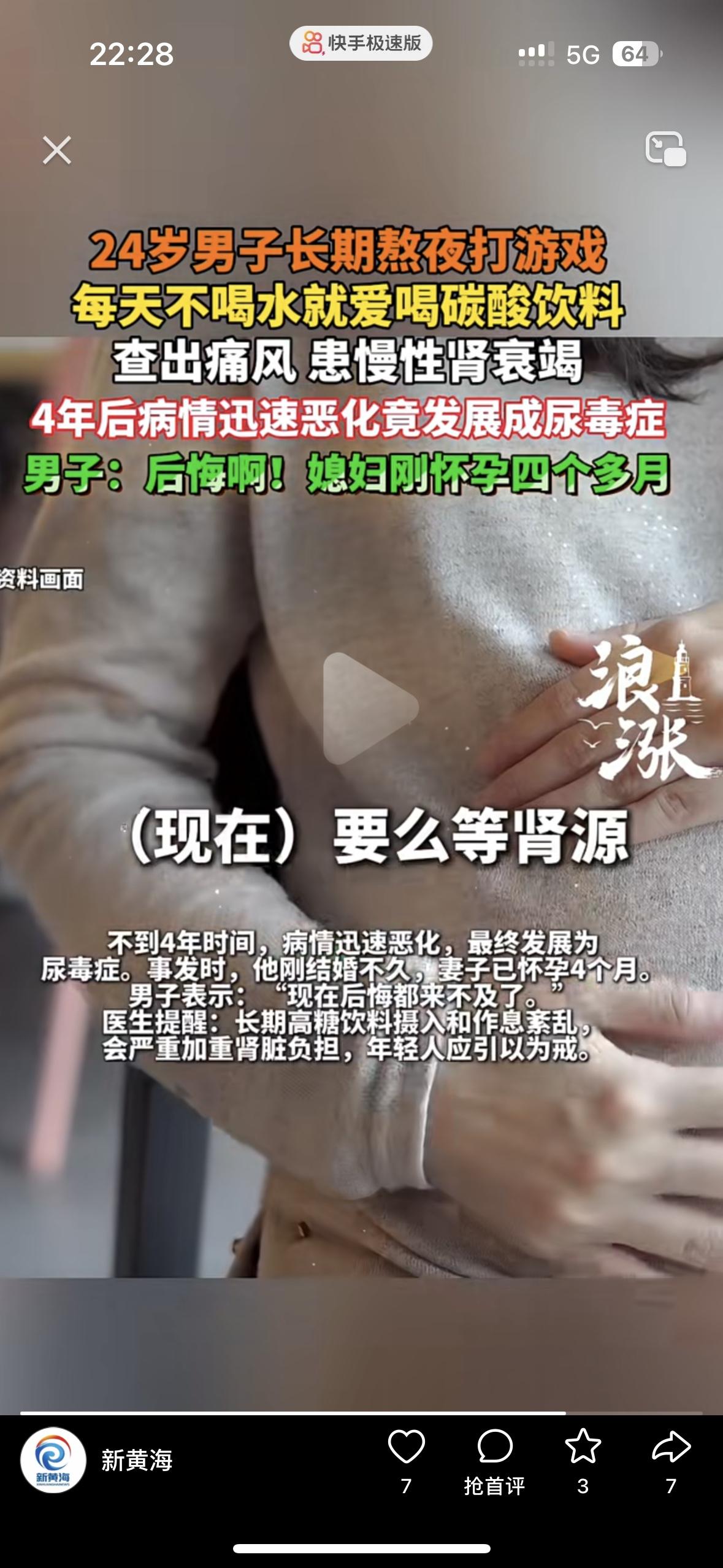 24岁的男子说他对不起怀孕4个月的老婆,不是他出轨了,也不是家暴了妻子 而是年纪轻轻的他,长期熬夜打游戏,每天不喝水只喝碳酸饮料,去医院查出来痛风,是慢性的肾衰竭 不到4年的时间发展成了尿毒症,而他刚结婚不久,妻子怀孕4个月了 现在后悔都来不及了,要么换肾,要么他就只能透析!这个病就是个伸手不见五指黑的洞,需要长期的治疗和费用,而怀孕4个多月的妻子以及将要出生的孩子是他最对不起的人!大家一定问引以为戒,本来一个美好的家庭就这么毁了