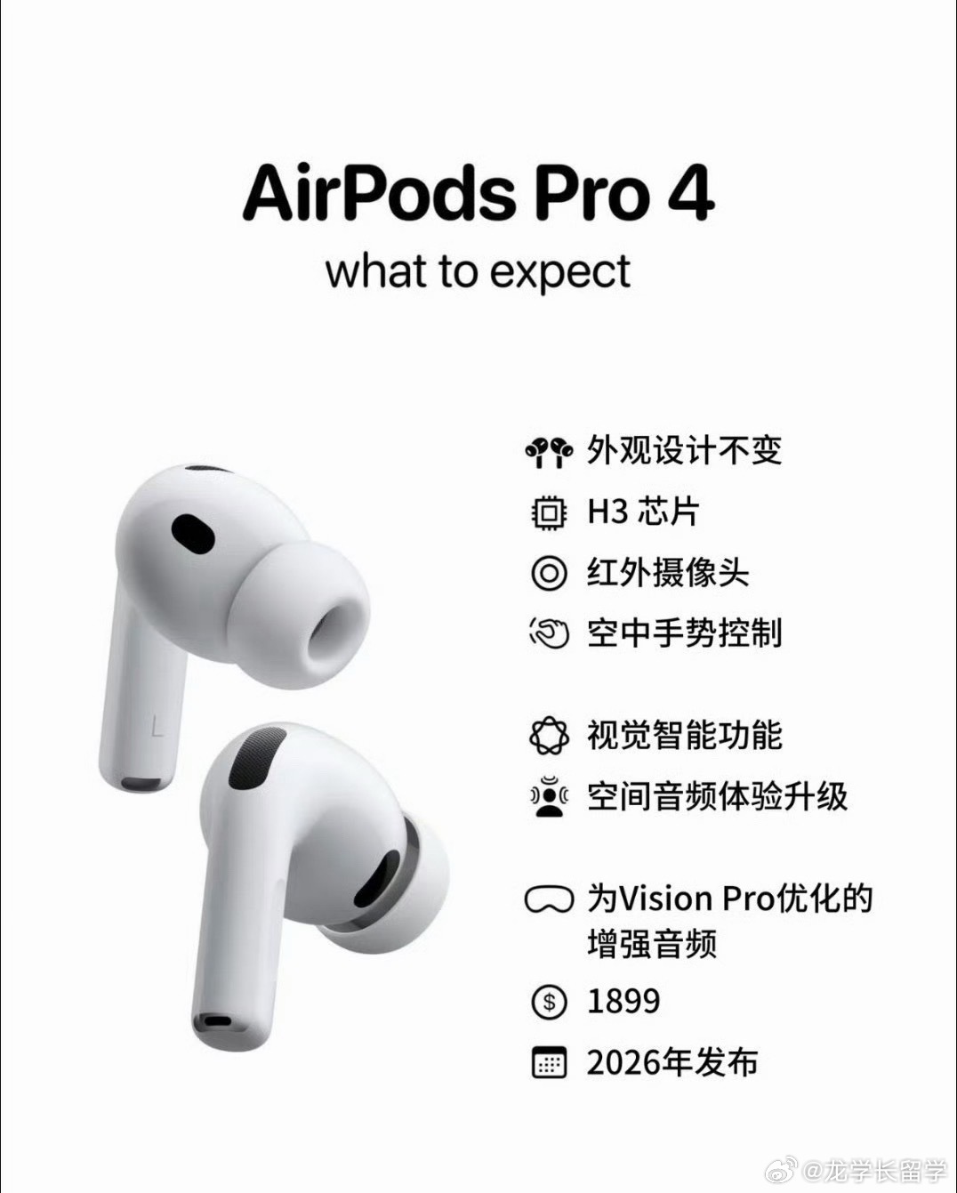 按现在曝光的信息来看,新耳机大概率会用上H3或更强的新芯片,音频体验再往上提一档;还可能内置红外摄像头,估计是为Apple Intelligence做准备;另外也有消息说会加入空中手势操控,代替现在的压感操作。这波升级力度你们觉得怎么样?新款AirPodsPro曝光
