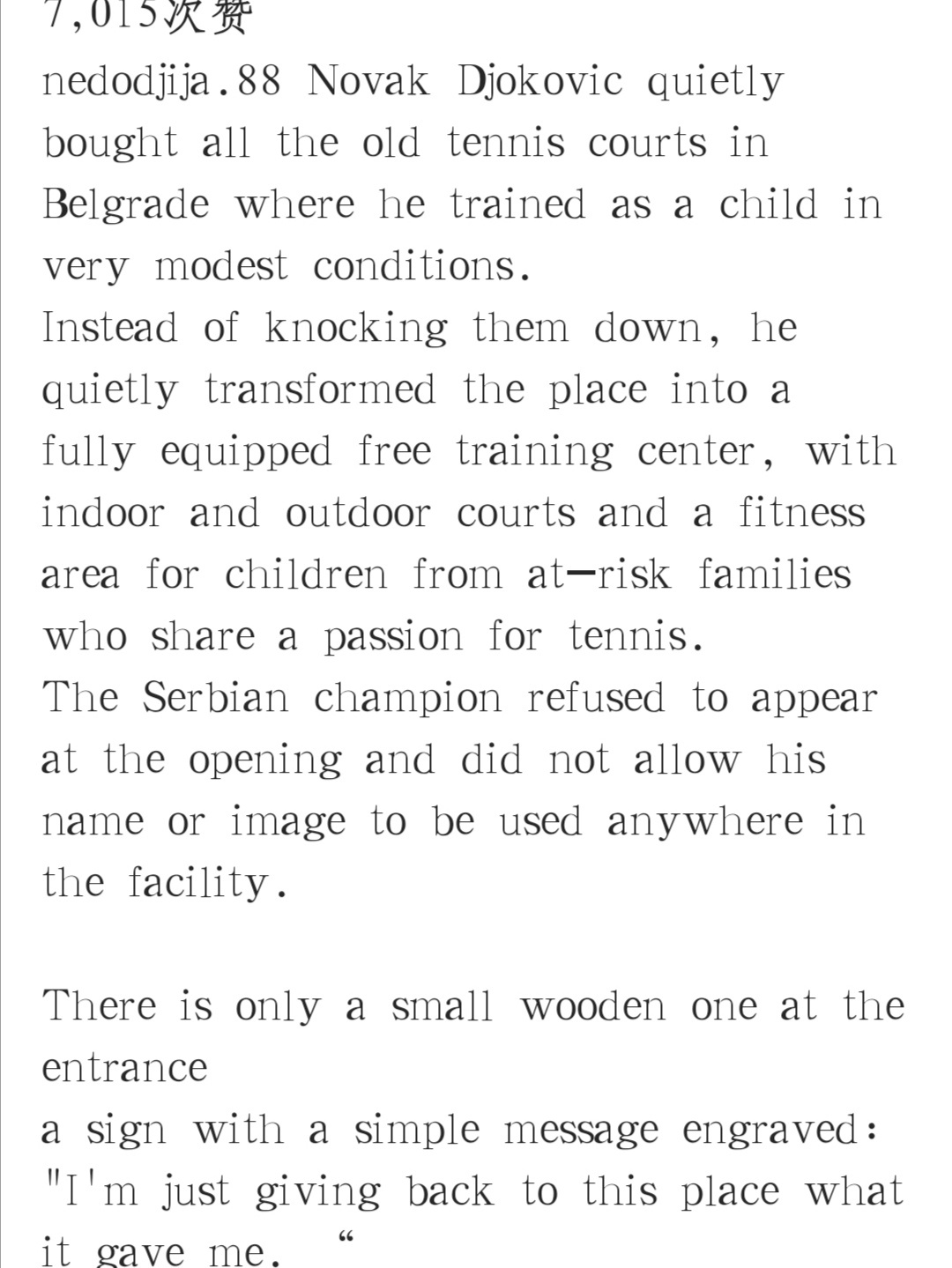 德约科维奇 你闹悄悄买下贝城球场供穷孩子使用
