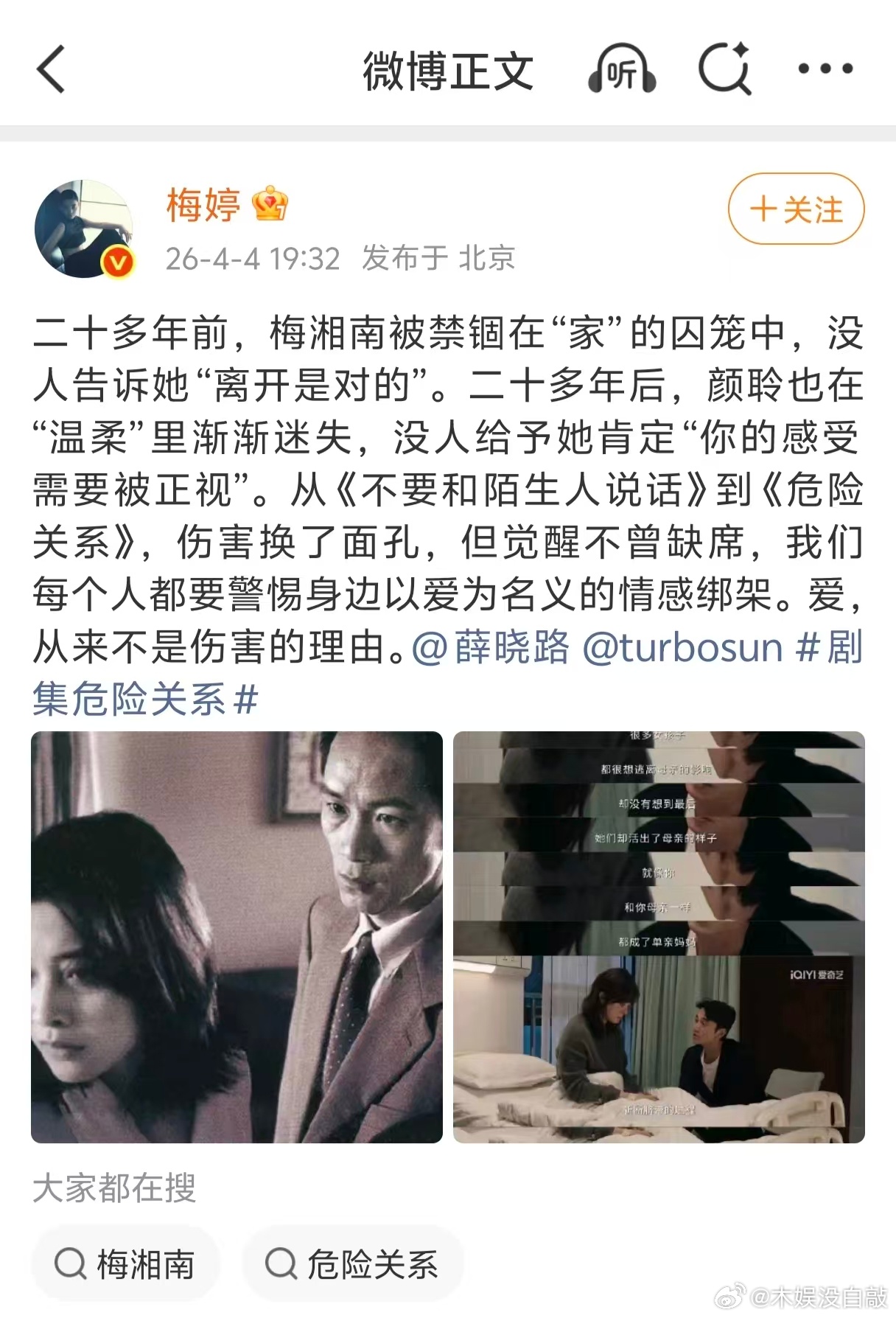 最可怕的伤害从不是拳脚相加,而是温柔包裹下的精神控制。梅湘南经历了显性的暴力,颜聆承受着隐性的PUA。二十五年来,伤害学会了伪装,但女性的自我救赎从未停止。梅婷孙俪隔空对话,道尽所有被困住的心声。剧集危险关系