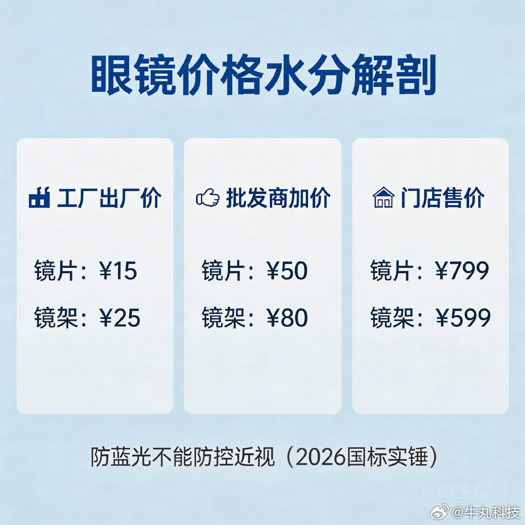 更离谱的是溢价逻辑:- 工厂价15元的镜片,门店敢卖799元(53倍!)- 25元的镜架,敢标几百上千- 纯钛成本几十块,敢卖两三千