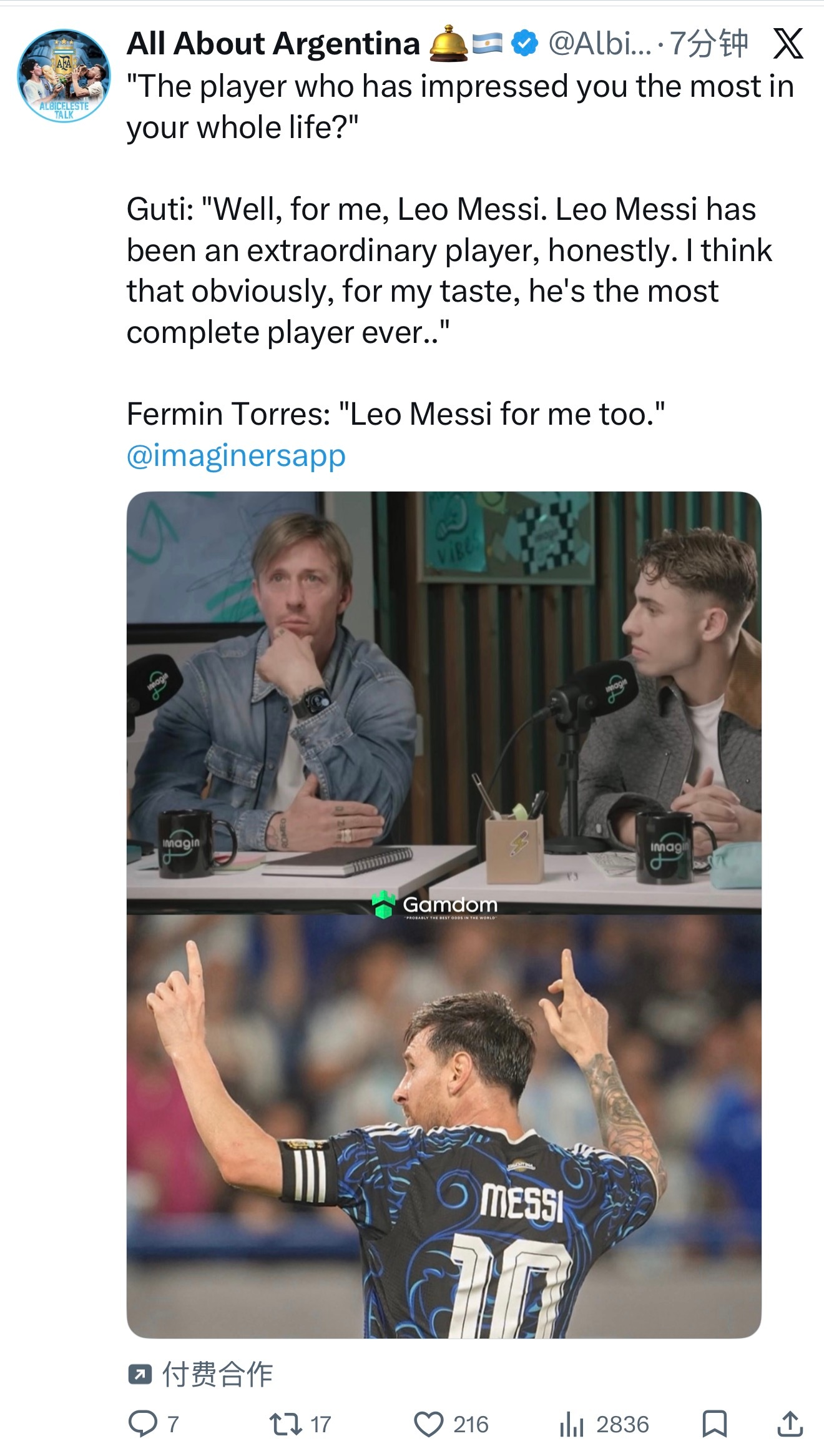 🗣️古蒂:“对我来说,是Lionel Messi。他真的非常出色,说实话,我觉得很明显——就我个人的审美来说,他是有史以来最全面的球员。”