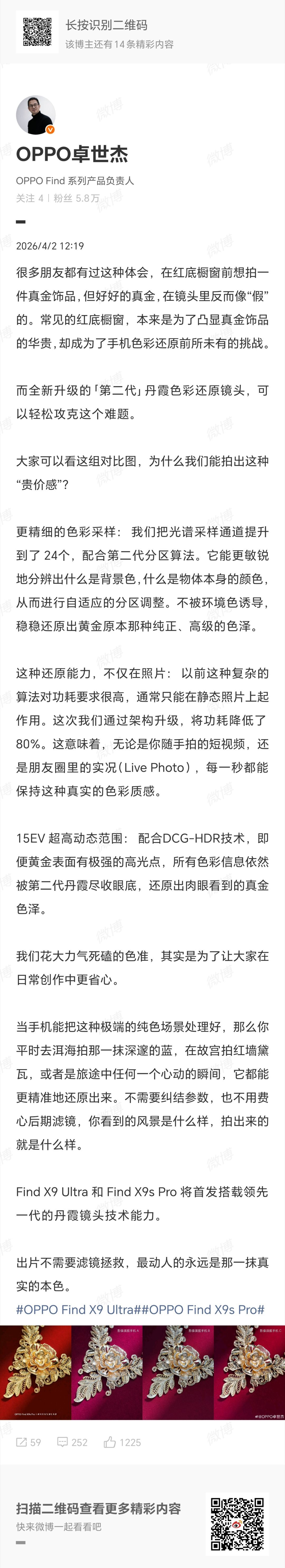 OPPO Find 系列产品负责人卓世杰发文,谈及了手机影像色彩还原能力。他表示,全新升级的「第二代」丹霞色彩还原镜头攻克了拍摄过程中真金饰品在红底橱窗中显假问题。