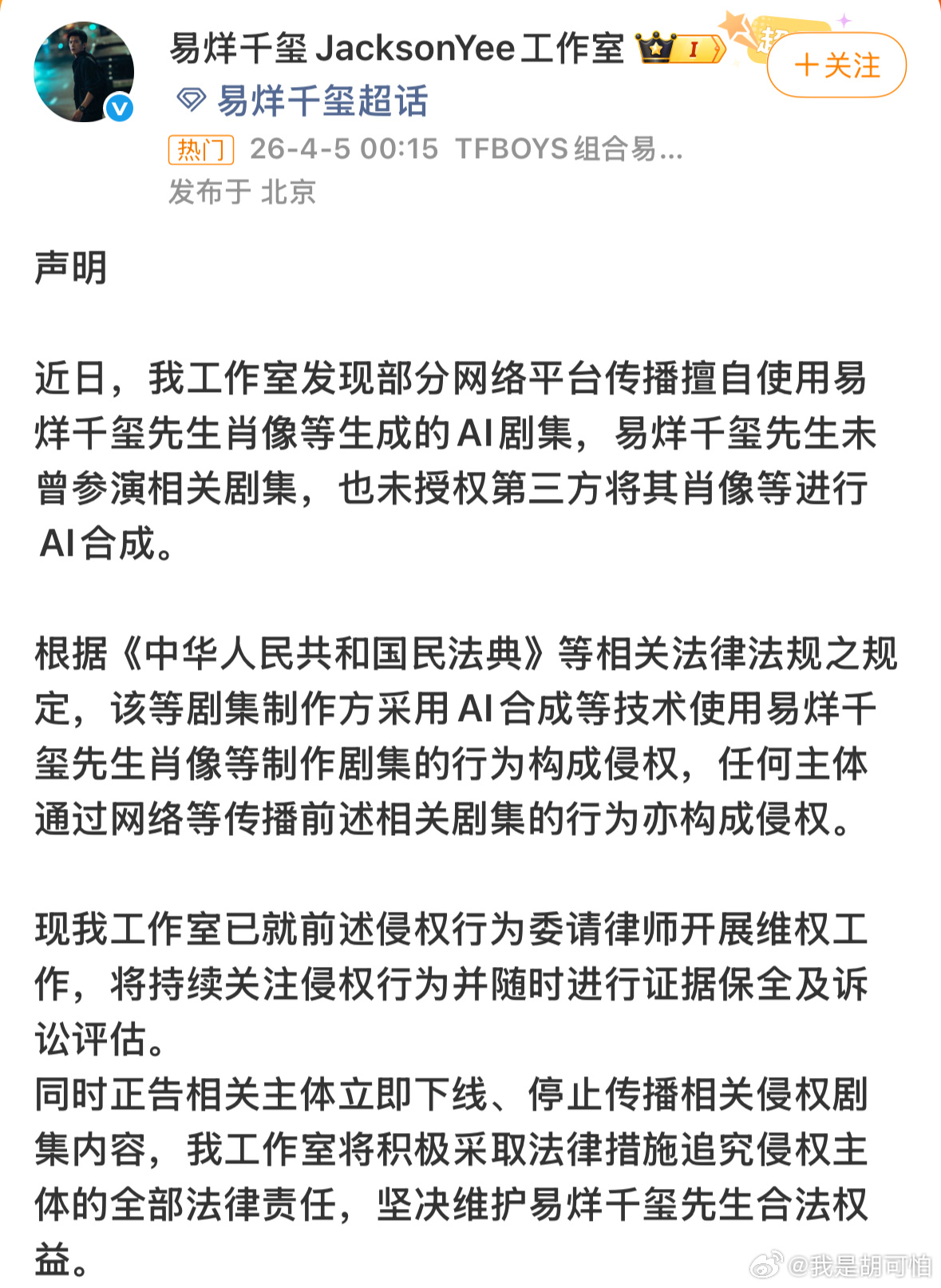 易烊千玺工作室发声维权,AI合成剧集未经授权属明确侵权,支持易烊千玺维权,拒绝AI偷脸商用,尊重艺人肖像