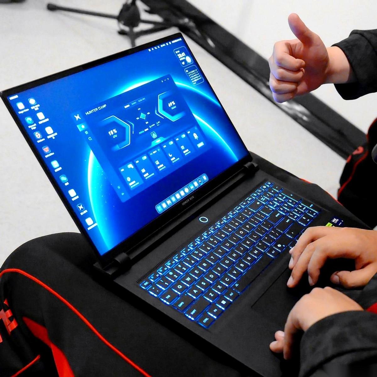 荣耀WIN游戏本就这么大喇喇地,出现在一个电竞战队的动态配图里。 不是谍照,不是爆料,就是一张高清大图,直接怼在人脸上。 机身纯黑,一块整板,多余的线条一条都找不到。只有中间那个硕大的RGB标志,在一片黑里亮得扎眼,生怕别人看不见。 键盘背光亮着,触控板也给得特别大方,窄边框屏幕几乎占满了整个盖子,机身上的贴纸更是把底牌都亮出来了——英特尔的芯,N家的卡。 但这些都不是重点。 重点是屏幕上那个叫“Hunter Camp”的界面,这玩意儿是干嘛的? 这哪是泄露,这简直就是把菜单拍你桌上,就差最后一道菜:价格。你觉得得准备多少?