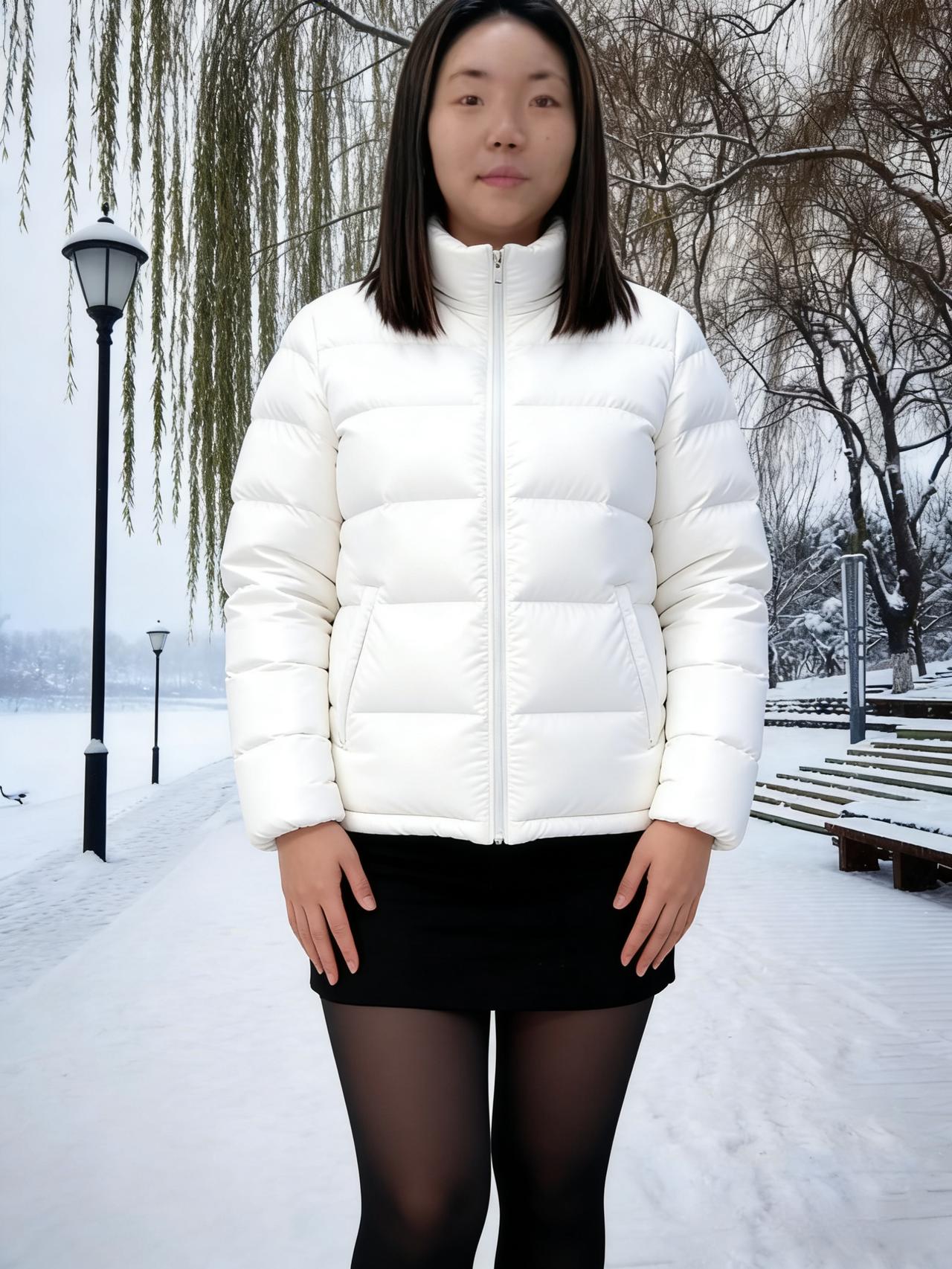 雪满长堤柳色残, 佳人独立影珊珊。 素衣轻拂寒烟里, 一顾倾城尽欢颜。